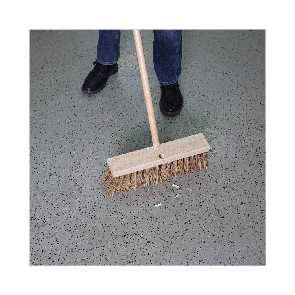 Long, coarse bristled brush head effectively pushes litter and debris with ease to clean more efficiently. Built with two tapered handle holes that enable front-to-back orientation changes for more even wear. For use with threaded 1.13-inch diameter handles, which are sold separately. 16” wide hardwood block brush for maximum coverage and durability. Ideal for hard, floor surfaces, indoors or outdoors.