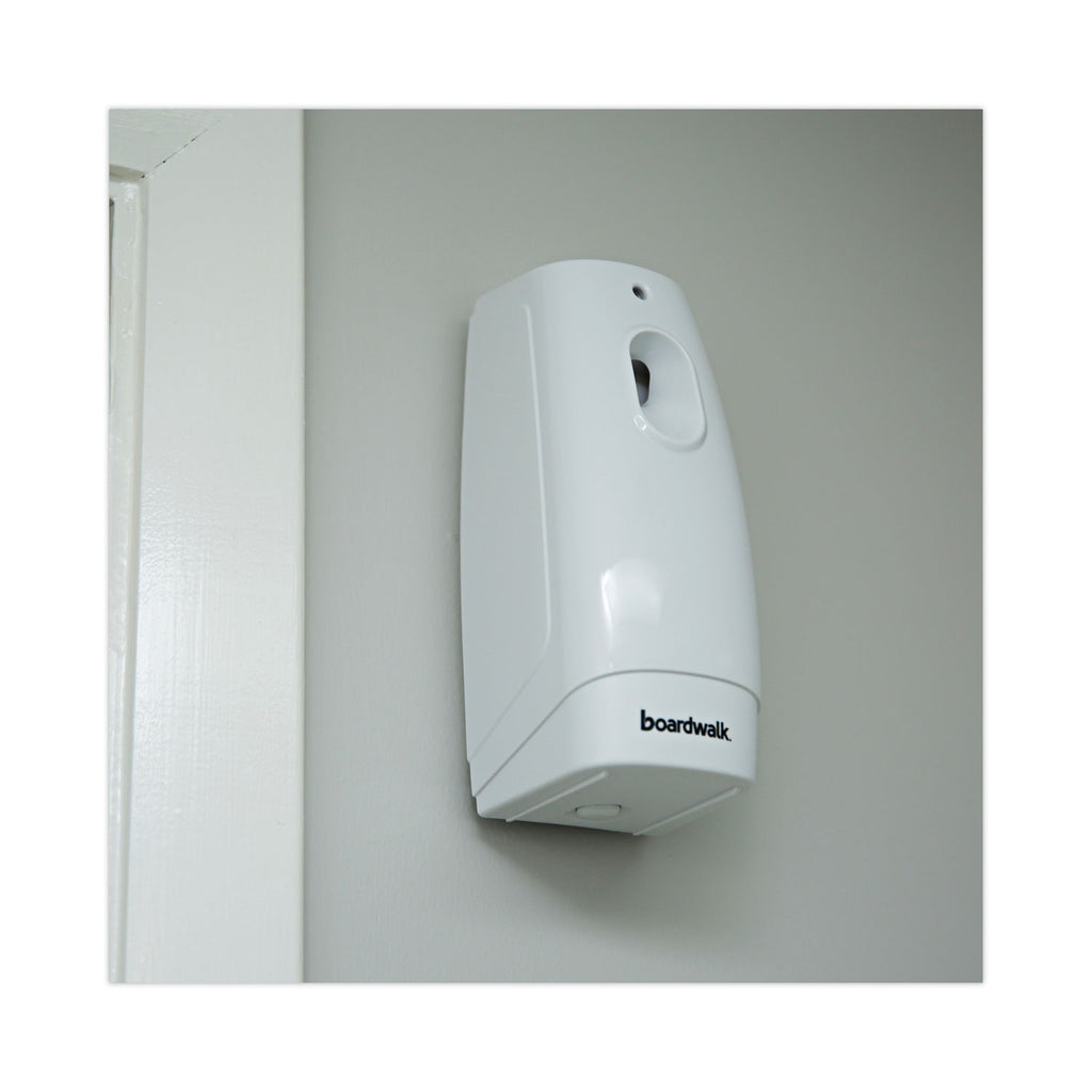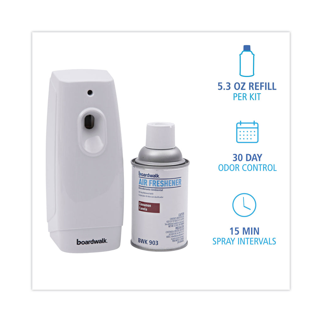 Boardwalk® Air Freshener Dispenser Starter Kit includes a metered air freshener and a 5.3 oz cinnamon sunset fragrance can. The classic, metered dispenser discreetly sprays a pleasant fragrance to mask odors. It automatically dispenses every 15 minutes, ensuring continuous air freshening in environments with unpleasant smells. Provides effective odor control for up to 30 days. Compatible with Boardwalk® Air Freshener 5.3 oz can refill. Operates on four AA batteries (not included). Mounting hardware included to mount to wall.