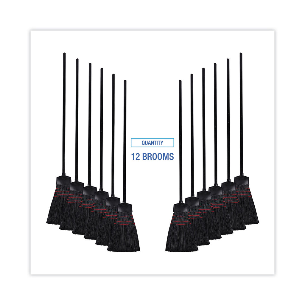 Convenient size maid broom for light-duty sweeping. Composed of a wooden handle with flagged-tip, long-lasting plastic bristles for added durability. The four rows of stitching and plastic shroud provided strength and dependability. Black color blends seamlessly into contemporary environments. Lightweight and portable for added mobility. Great for hotels, restaurants, lobbies, and household sweeping on a variety of floor types.