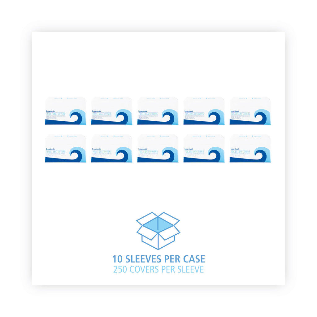 Show your visitors you care with premium, half-fold toilet seat covers to fit popular seat cover dispensers. Protects guests from germs and bacteria in high-use facilities. White tissue paper that's easily removed from package. Smooth paper is comfortable and doesn’t scratch the surface or person using it. Box has perforated opening for removing covers with or without a dispenser. Run out less often with 250 covers per sleeve.