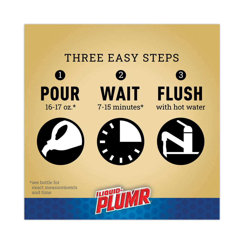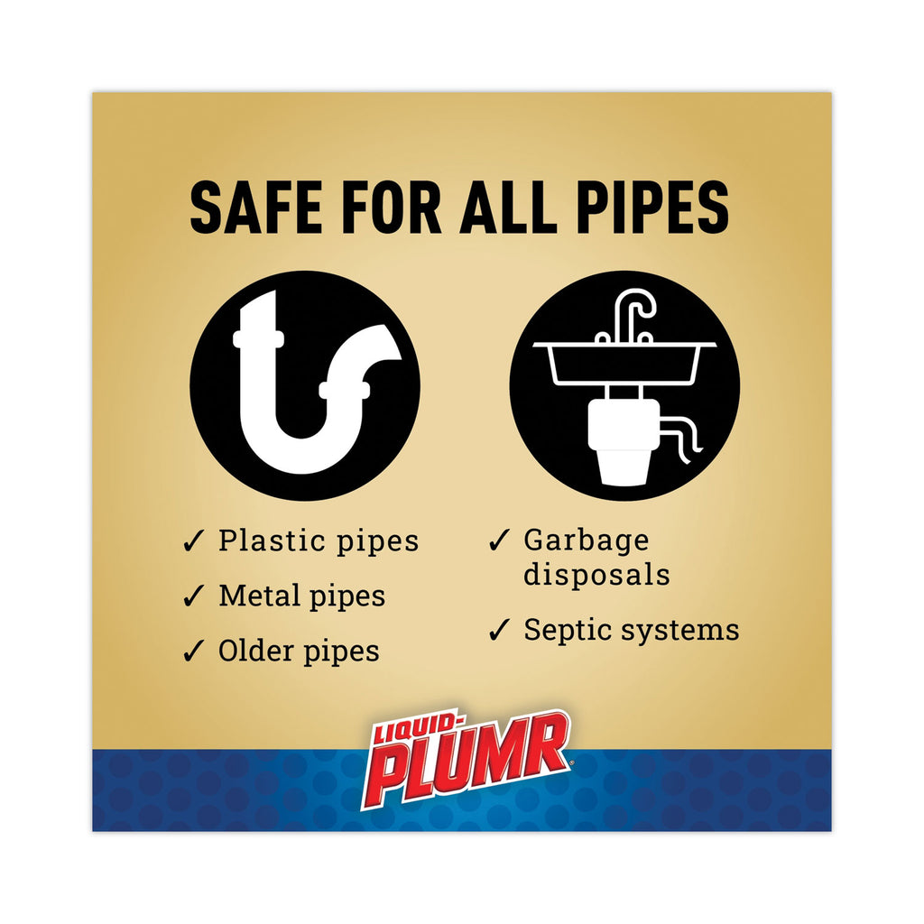 Get three-in-one, clog-fighting action with Liquid-Plumr® Clog Destroyer and PipeGuard. It cuts through standing water to clear fully-blocked drains, prevents clogs with regular monthly use and protects pipes. This powerful system removes hair, gunk, grease and soap scum whether you have a total blockage or a slow-running drain, while Pipeguard prevents pipes from being damaged as the clog dissolves. It works in the bathtub, shower, bathroom sink, kitchen sink and garbage disposal, and when used monthly prevents buildup and stops clogs from forming. This drain cleaner is safe for all septic systems, garbage disposals and pipes, including PVC, plastic, metal and old pipes. Do not use with a plunger, in toilets or with ammonia, toilet bowl cleaners, or non-Liquid-Plumr clog removers (to avoid hazardous gas). Excessive heat or cold may cause Liquid-Plumr® to form clumps, but this should not affect performance. Ideal for use in schools, daycare centers, restaurants, hotels and other commercial facilities.