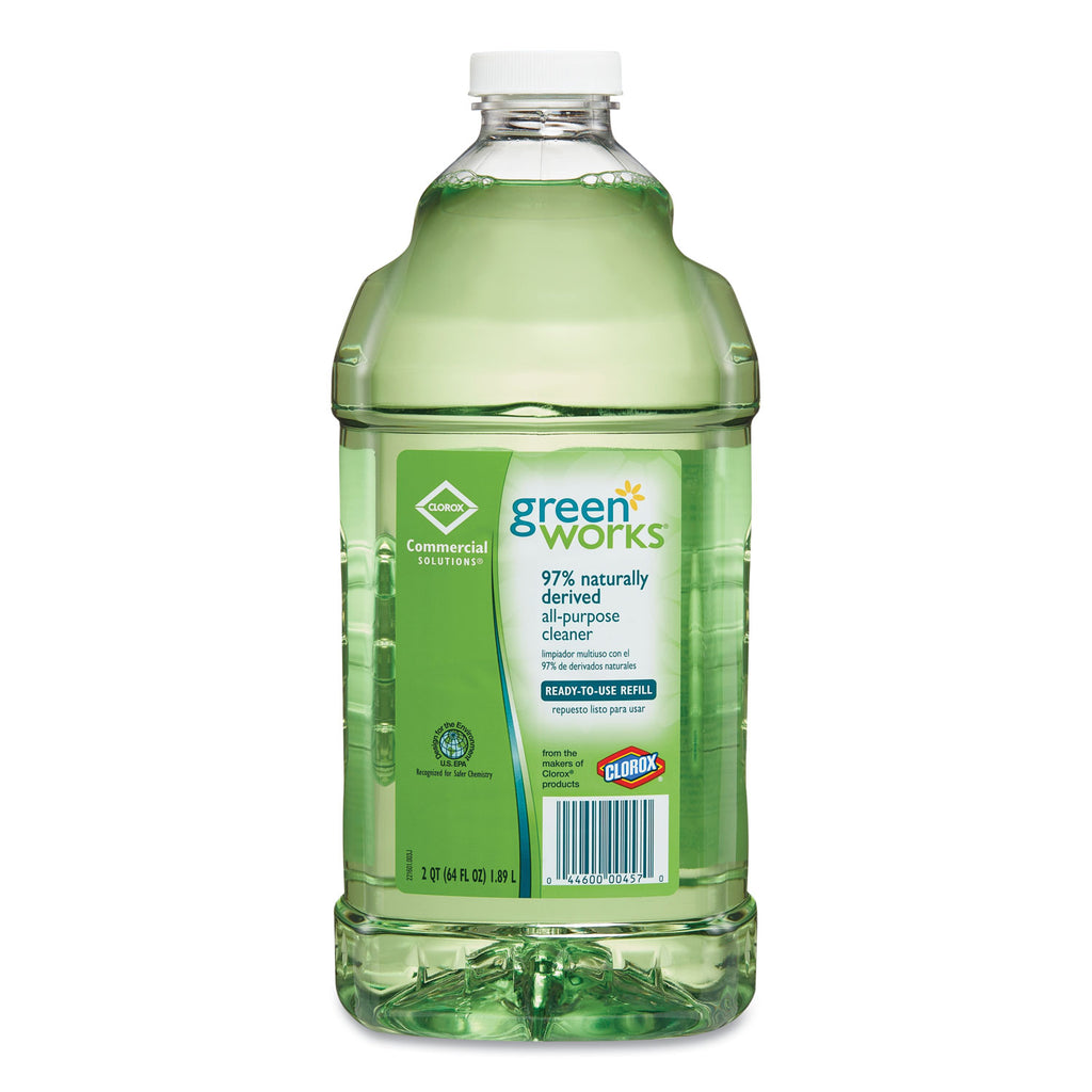 Green Works All Purpose Cleaner combines powerful cleaning performance with naturally derived and plant-based ingredients to safely tackle messes throughout the workplace. This all-purpose cleaner cuts through grease, grime and dirt with ease without any harsh chemical fumes or residue. It's suitable for use on a variety of surfaces including counters, appliances, stainless steel, sealed granite, chrome, sinks and toilets, making it ideal for use in commercial kitchens, schools, offices, day care centers and other business facilities. From Clorox Commercial Solutions, this all purpose cleaner is recognized by the U.S. EPA's Safer Choice Program. With Green Works naturally derived cleaning products, you get powerful cleaning done naturally.