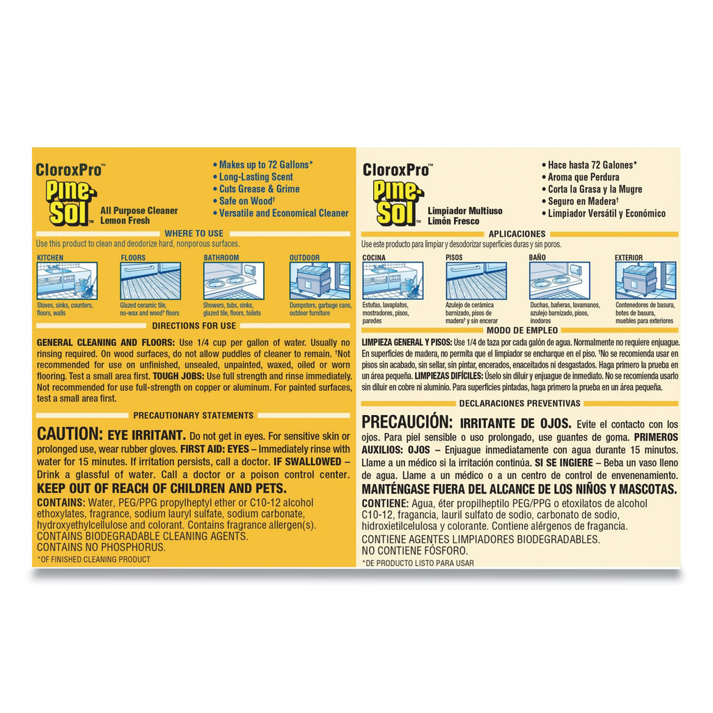 CloroxPro Pine-Sol All Purpose Cleaner gives you 4X cleaning action cutting through dirt, grime and grease, while deodorizing throughout your home, office or commercial facility and a great, long lasting scent. This concentrated formula cleaner can tackle any challenge; just mix Pine-Sol with water at different strengths to adjust your cleaning power each time, unlike premixed cleaners. Pine-Sol All Purpose Cleaner is safe to use on most hard non-porous surfaces including finished hardwood, ceramic tile, linoleum, plastic, and leaves no sticky residue. It's ideal for use in offices, day care centers, schools, hotels, restaurants and other commercial facilities. With the power of Pine-Sol on your side, you only have to clean once to get the job done right.