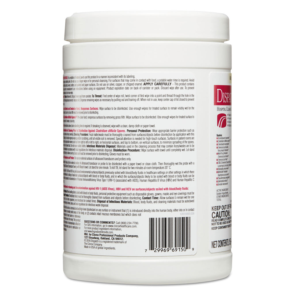 Dispatch® Hospital Cleaner Disinfectant Towels with Bleach are intermediate-level hospital disinfectant wipes that meet CDC CMS and OSHA guidelines for cleaning and disinfecting surfaces in healthcare facilities. They are ready to use, one-step cleaner-disinfectant wipes containing a 1:10 bleach dilution. These premoistened towels are EPA-registered to kill C. Difficile spores in three minutes and other common healthcare pathogens just one minute. These wipes kill 99.9999% of C. difficile spores, according to the current EPA recommended testing standard (June 2014). This is for clinical usage for disinfecting equipment and high-touch surfaces. These wipes feature an anticorrosion agent and are formulated for broad surface compatibility with healthcare surfaces including stainless steel, glass, plastic, porcelain, glazed ceramic, laminated surfaces and vinyl. Features a light fragrance for patient and staff comfort. Intended for use in healthcare settings.