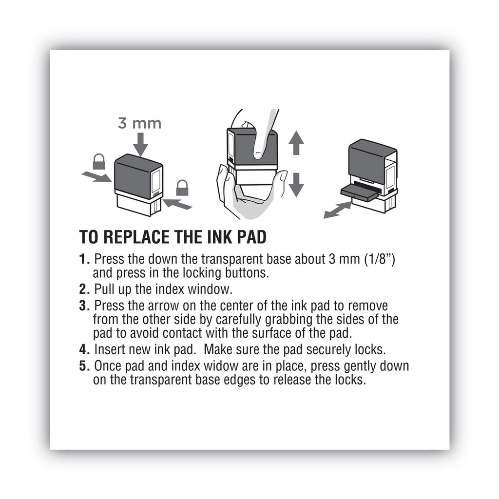 Changing ink pads is easy with this snap in, snap out cartridge style. Delivers up to 5,000 impressions.