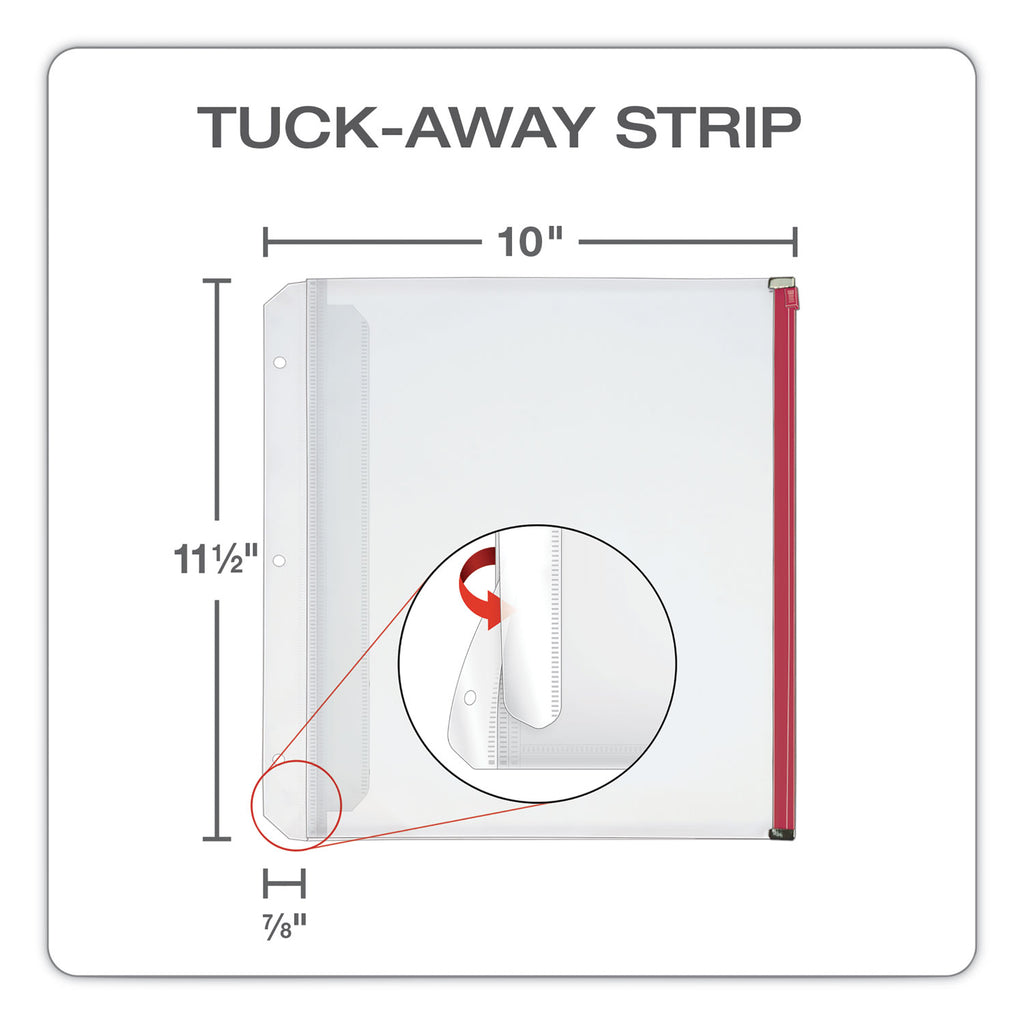 Cardinal® Poly Zippered Binder Pockets store and protect critical documents. These side-loading three-hole-punched inserts expand 1/2" to hold up to 100 sheets. Colorful slide zippers keep it all contained. Clear poly is non-stick and archival safe for documents and photos. Keeps critical papers—from passports to term papers—safe from accidents and spills. With zippers in blue, black, red, purple and green for color-coded organization.