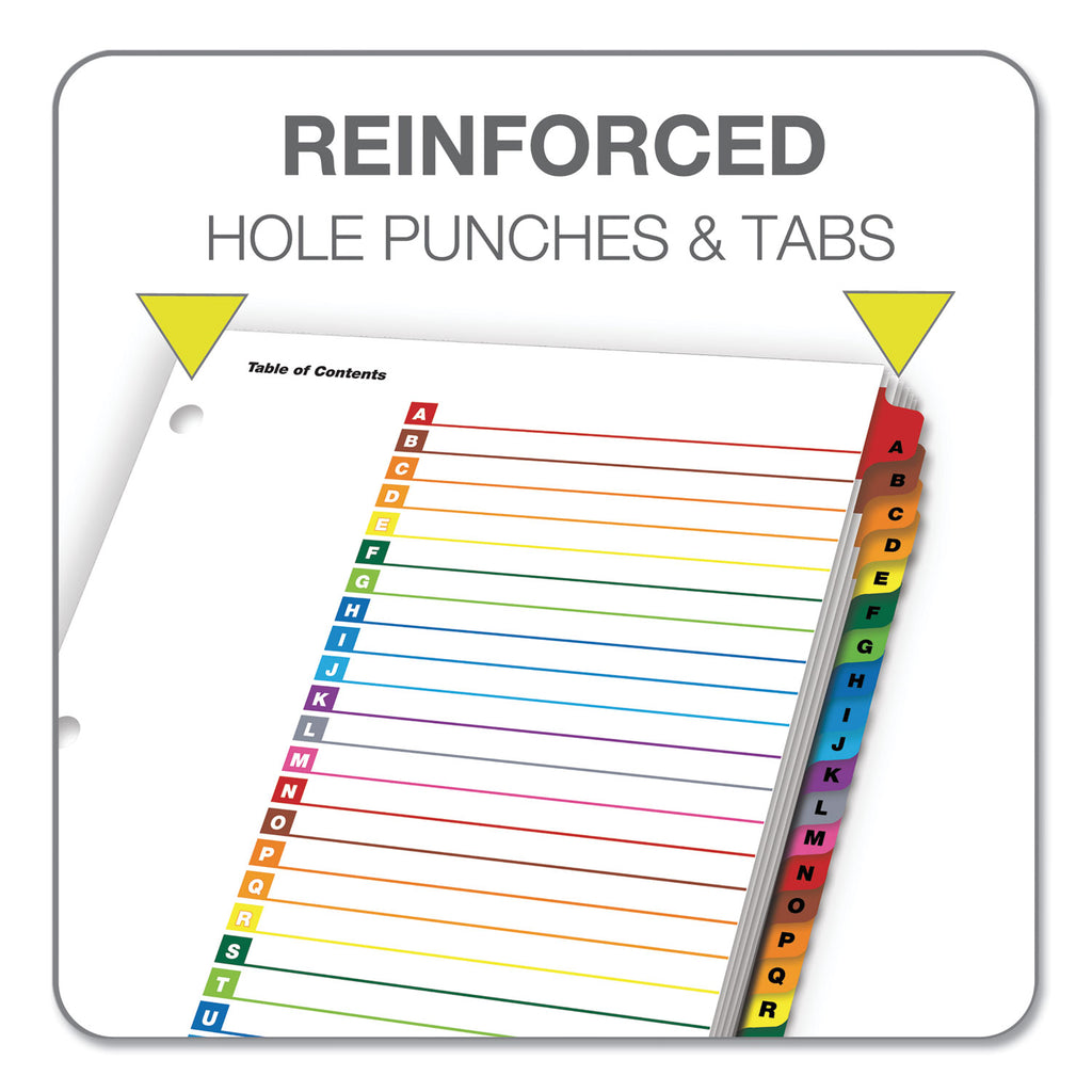Cardinal® OneStep® Table of Contents Dividers help you create an index system instantly. Matching, preprinted tabs on the divider sheets can be used in either vertical or landscape formats. Tab sets have coordinating Table of Content sheets. Easy to use, free templates in your favorite software are available online; details on packaging. Tabs and ring edges are reinforced to withstand heavy use. Laser and inkjet compatible. Three-hole punched and sized for 8.5" x 11" sheets.