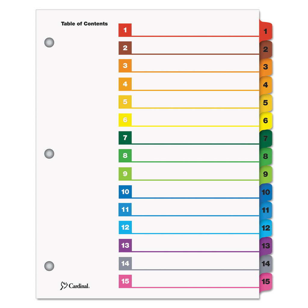 Cardinal® OneStep® Table of Contents Dividers help you create an index system instantly. Matching, preprinted tabs on the divider sheets can be used in either vertical or landscape formats. Tab sets have coordinating Table of Content sheets. Easy to use, free templates in your favorite software are available online; details on packaging. Tabs and ring edges are reinforced to withstand heavy use. Laser and inkjet compatible. Three-hole punched and sized for 8.5" x 11" sheets.