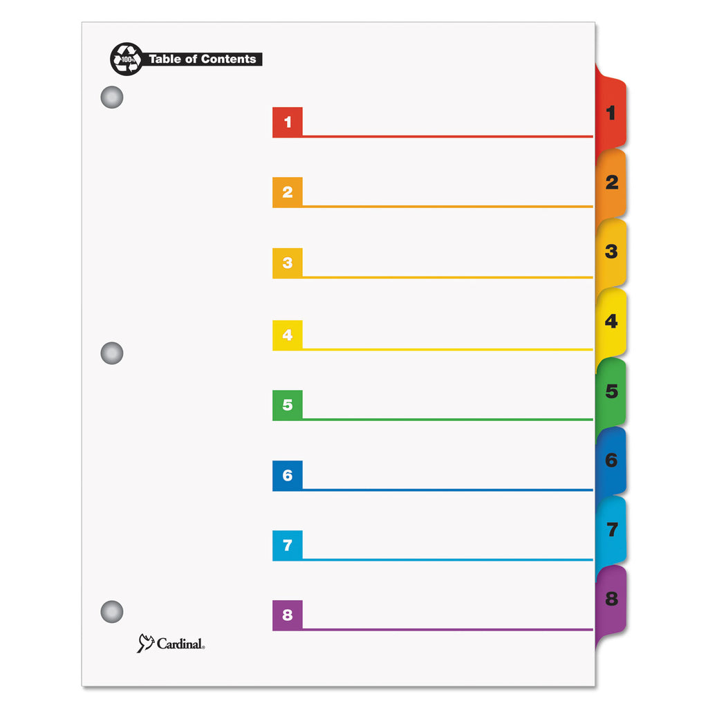 Paper is made entirely of post-consumer recycled fiber. Customize index sets by printing onto the Table of Content sheets. Matching, preprinted tabs on the divider sheets can be used in either portrait or landscape formats. Multicolored tab sets have coordinating, multicolored Table of Content sheets. Easy to use, no-cost templates in your favorite software are available online; details on packaging. Tabs and ring edges are reinforced to withstand heavy use. Laser and inkjet compatible. Three hole-punched.