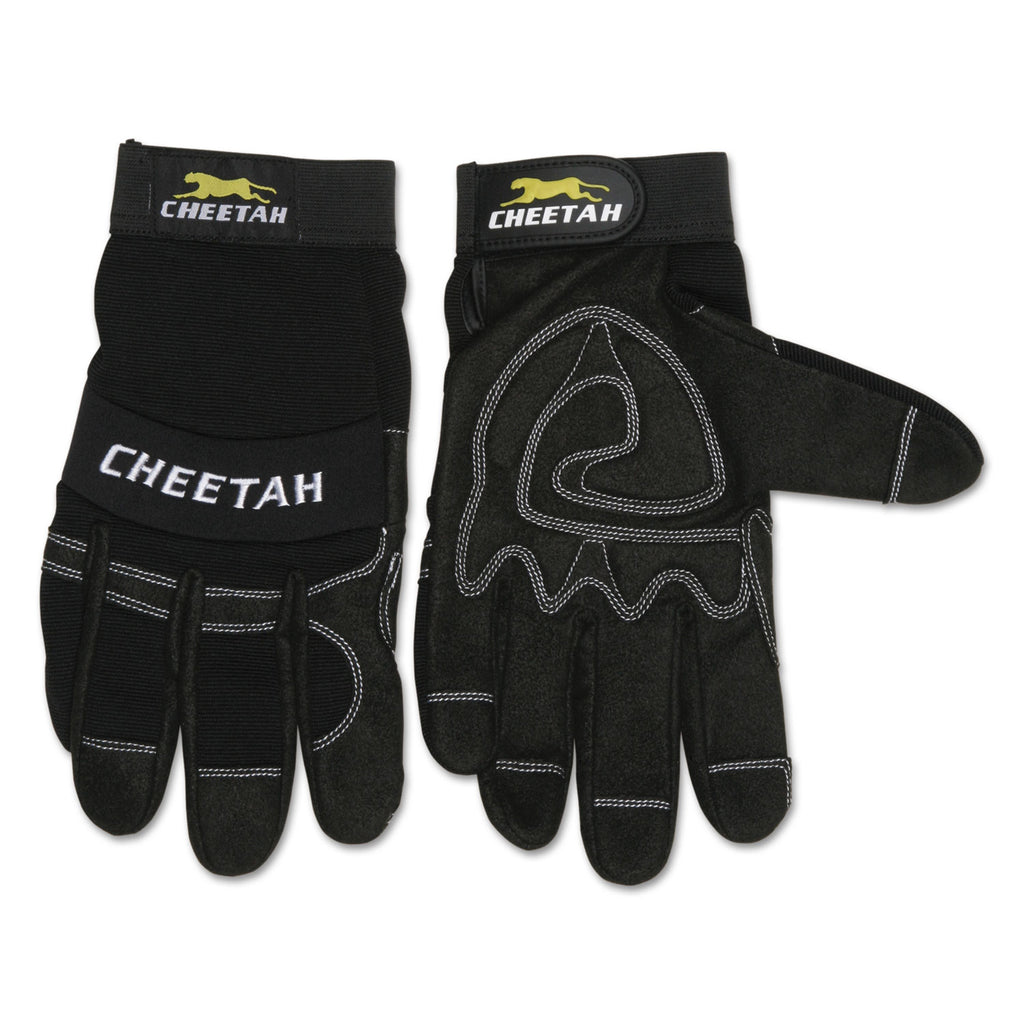 Cheetah multi-task gloves stand up to grease and grime, with a dark coloring that helps hide dirt. Sturdy gloves with a synthetic leather palm provide the grip, durability and protection for tough tasks. Black "G" shape gel pad in the palm and index finger for extra comfort and grip. Comfortable spandex back. Vented finger sidewalls and fourchettes. Hook and loop wrist closure for custom fit.