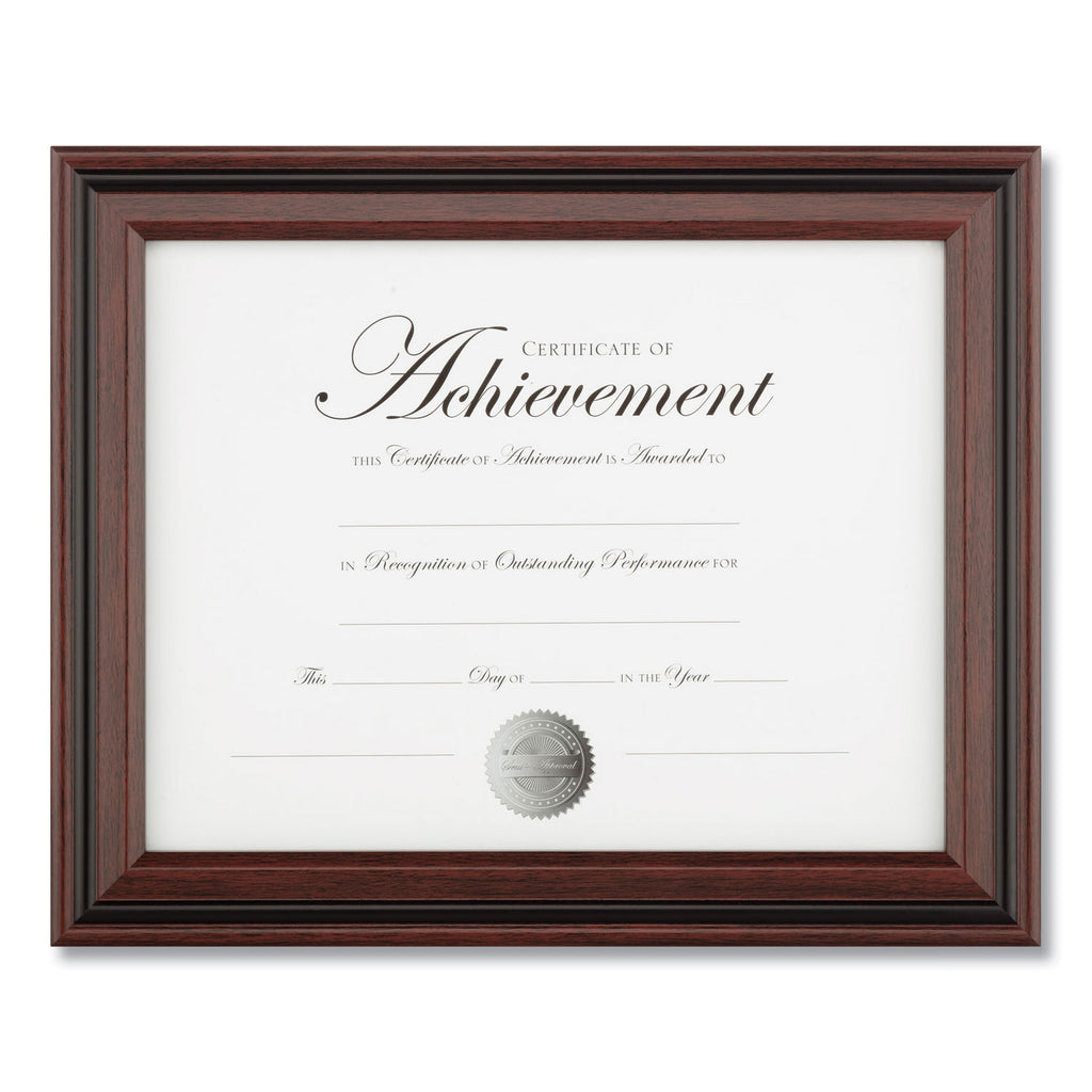 Two tone rosewood/black frame handsomely displays your documents and certificates. The wide profile frame adds sophistication to your home or office décor. It has a two-way easel back for desktop, and also hangs vertically or horizontally. Includes a usable certificate.
