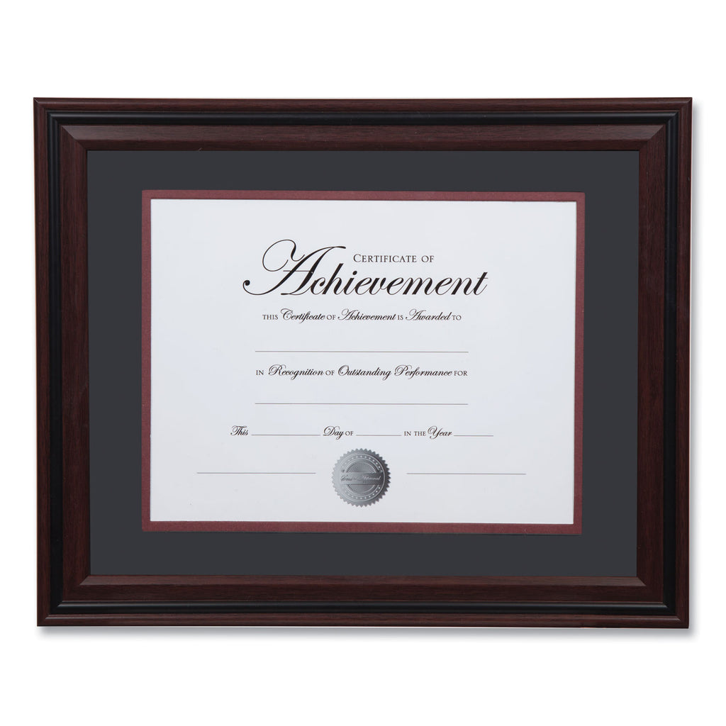 Two tone rosewood/black frame handsomely displays your documents and certificates. The wide profile frame adds sophistication to your home or office décor. It has a two-way easel back for desktop, and also hangs vertically or horizontally. Includes a usable certificate.
