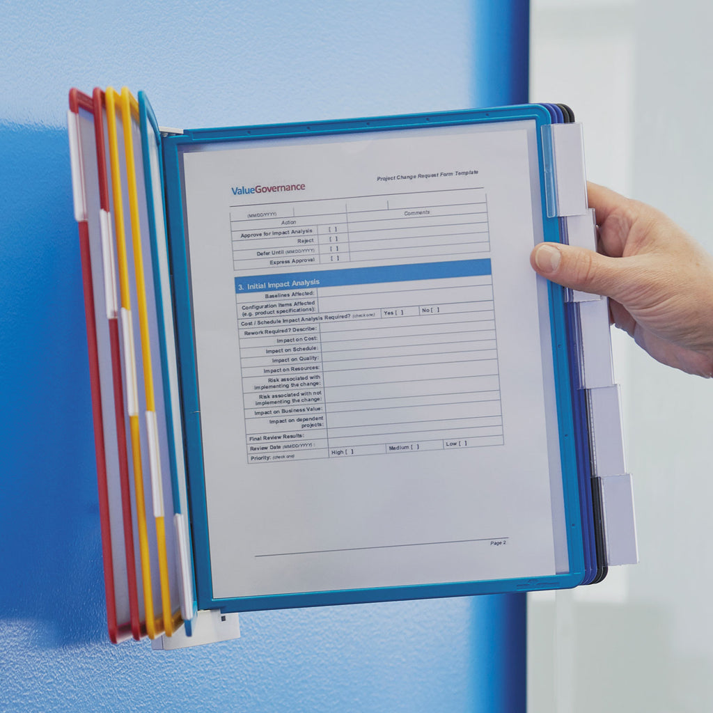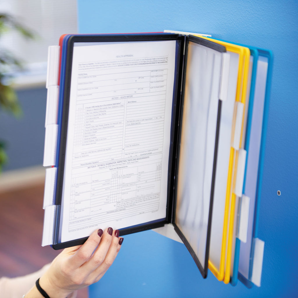 Angled wall bracket to keep sleeves open. Expand by adding systems side by side. Glare-free, polypropylene sleeves with rugged frames for heavy use. Includes wall bracket with mounting hardware and template, sleeves and snap-on tabs.