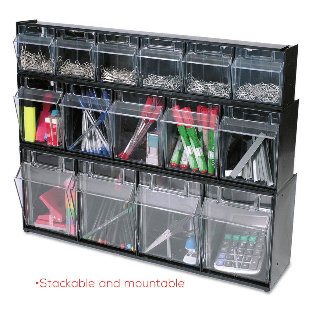 These Interlocking Tilt Bins® are perfect for organizing office supplies, break rooms, maintenance closets, craft storage and more. The dovetail design lets you stack and connect units together to form a custom modular system. Mix and match different sized units to meet your storage needs. Transparent bins tilt out and stay open for easy identification and access. Bins can be easily removed for cleaning and refilling. Can be wall mounted or used on countertop. Identification labels and mounting hardware included.
