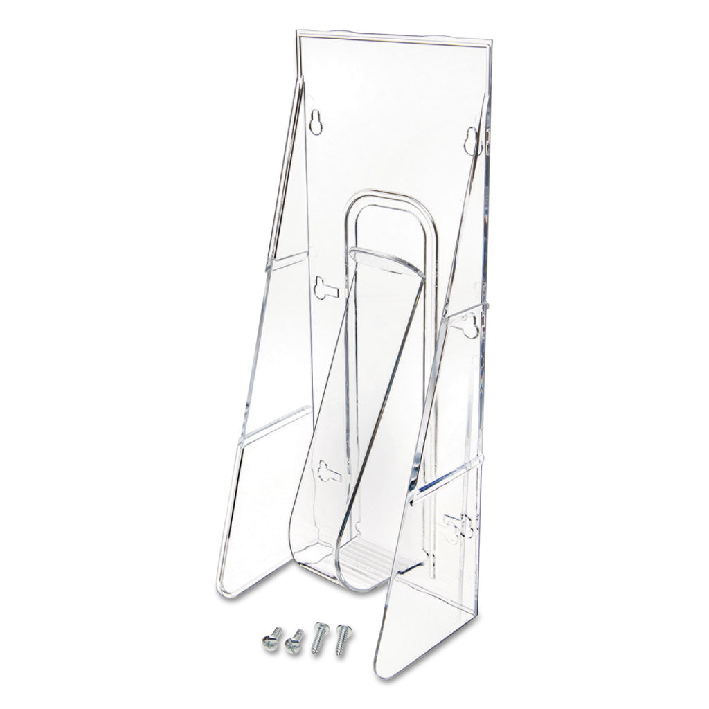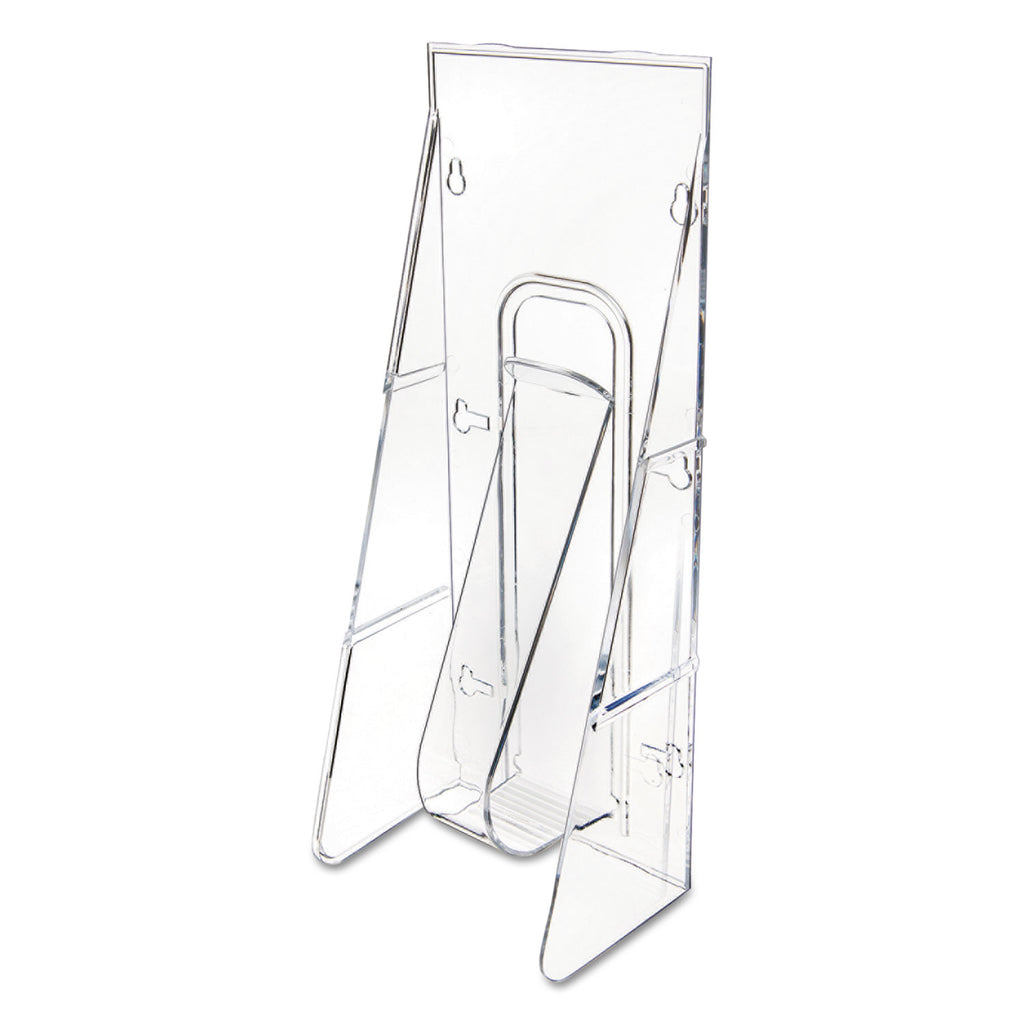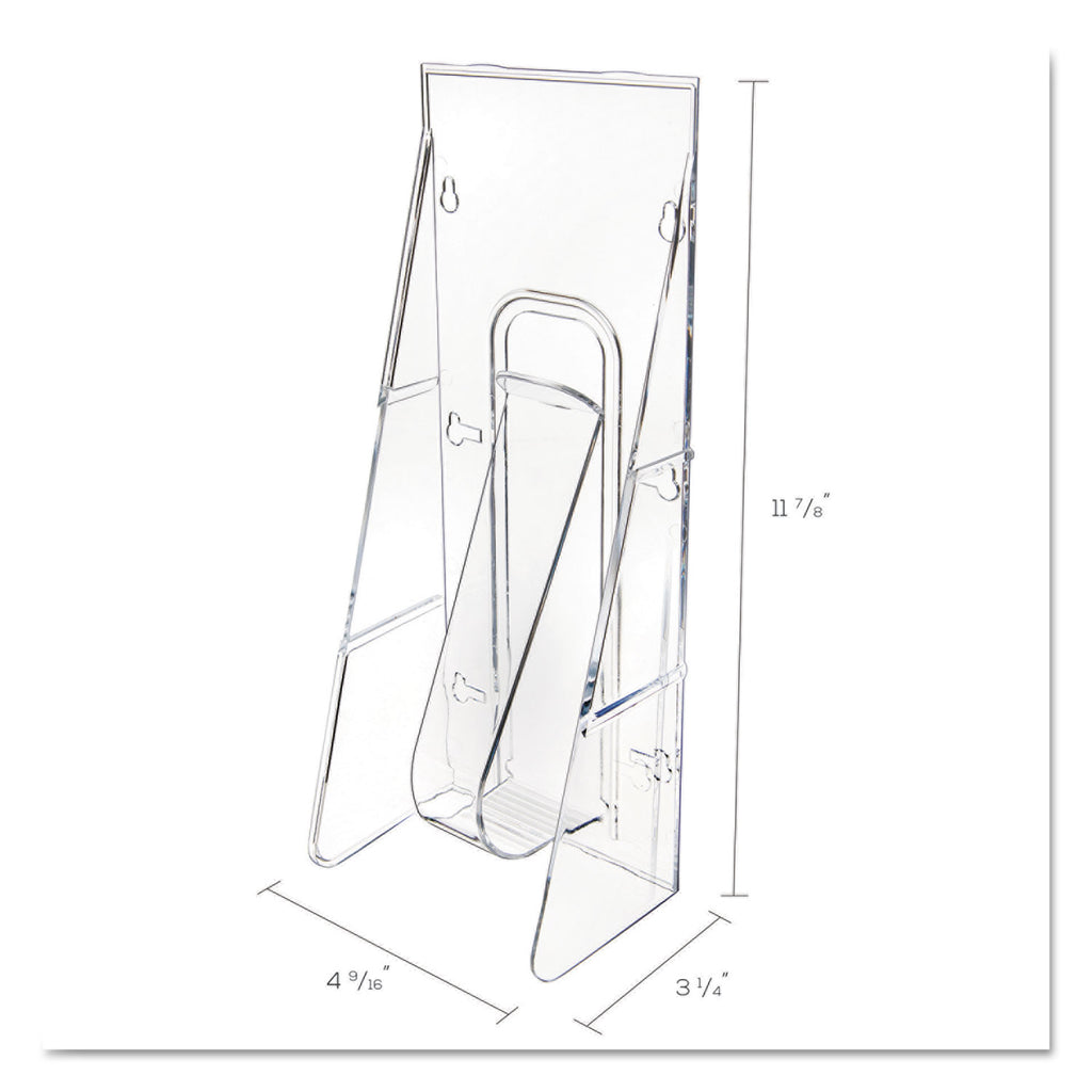 Showcase brochures, catalogs and more in this sleek, contemporary pocket. Unique tension bracket keeps literature upright for excellent visibility and a consistently tidy look. Stair-step design prevents sheets from sliding. Clear plastic pockets are virtually unbreakable and tongue and groove sides connect together to create a custom display. 2 5/8" capacity per pocket.