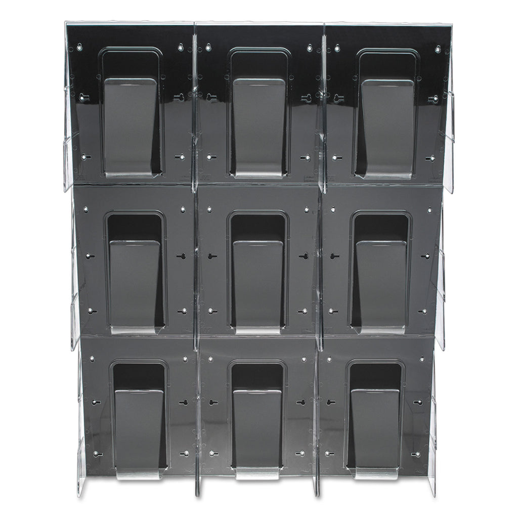 Plastic pockets are virtually unbreakable and feature the exclusive spring-action design of the Stand Tall® break-resistant tongue that secures literature upright. Clear literature holders mounted on black panel. 2 5/8" capacity per pocket. Predrilled for wall mounting (hardware included).