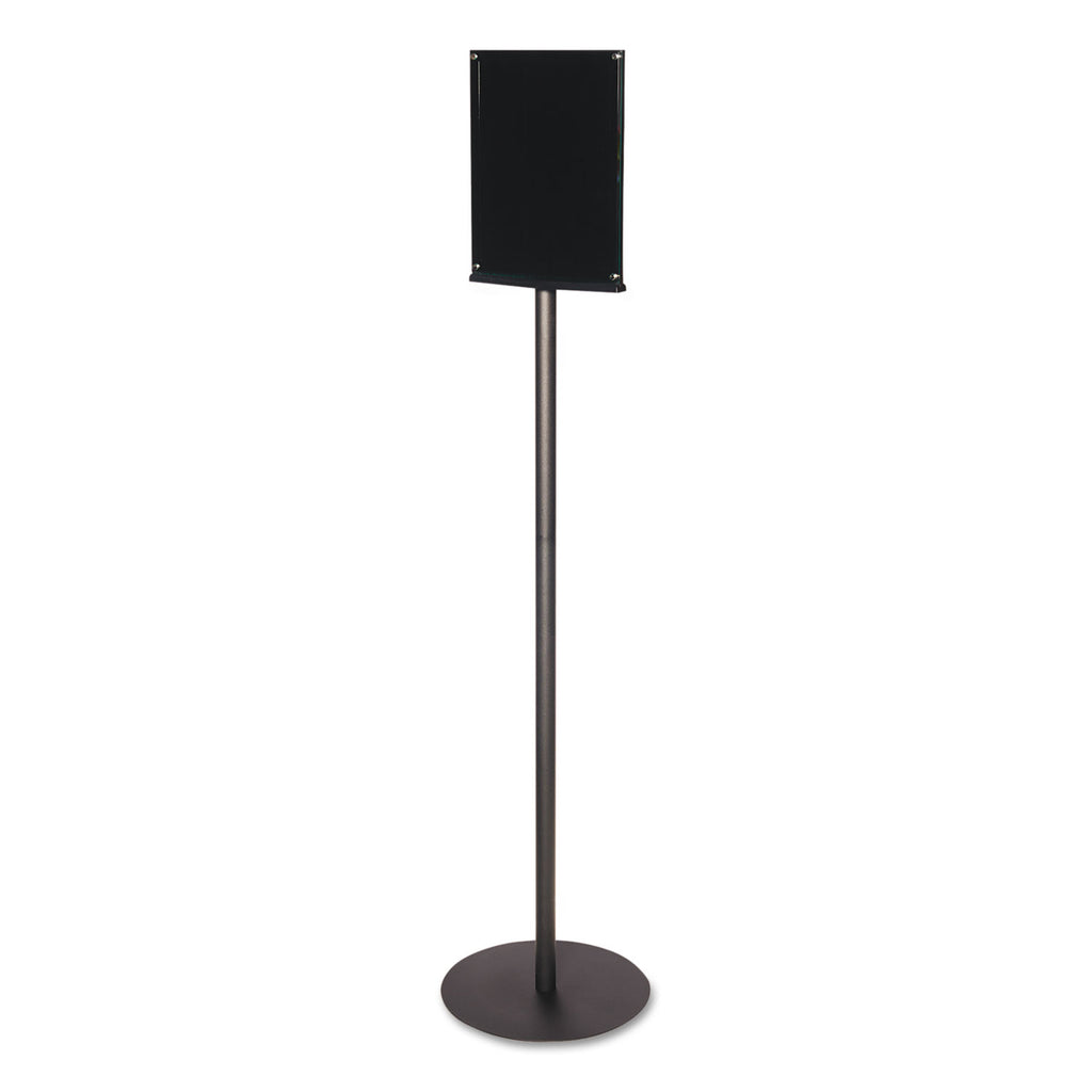 Double-sided floor stand allows front and back display. Features patented thick clear magnetic panels with green-tinted and beveled edges that give the look of glass. Permanent black back panel frames messages. Weighted base provides stability. Made from acrylic for strength and durability. Light assembly required.