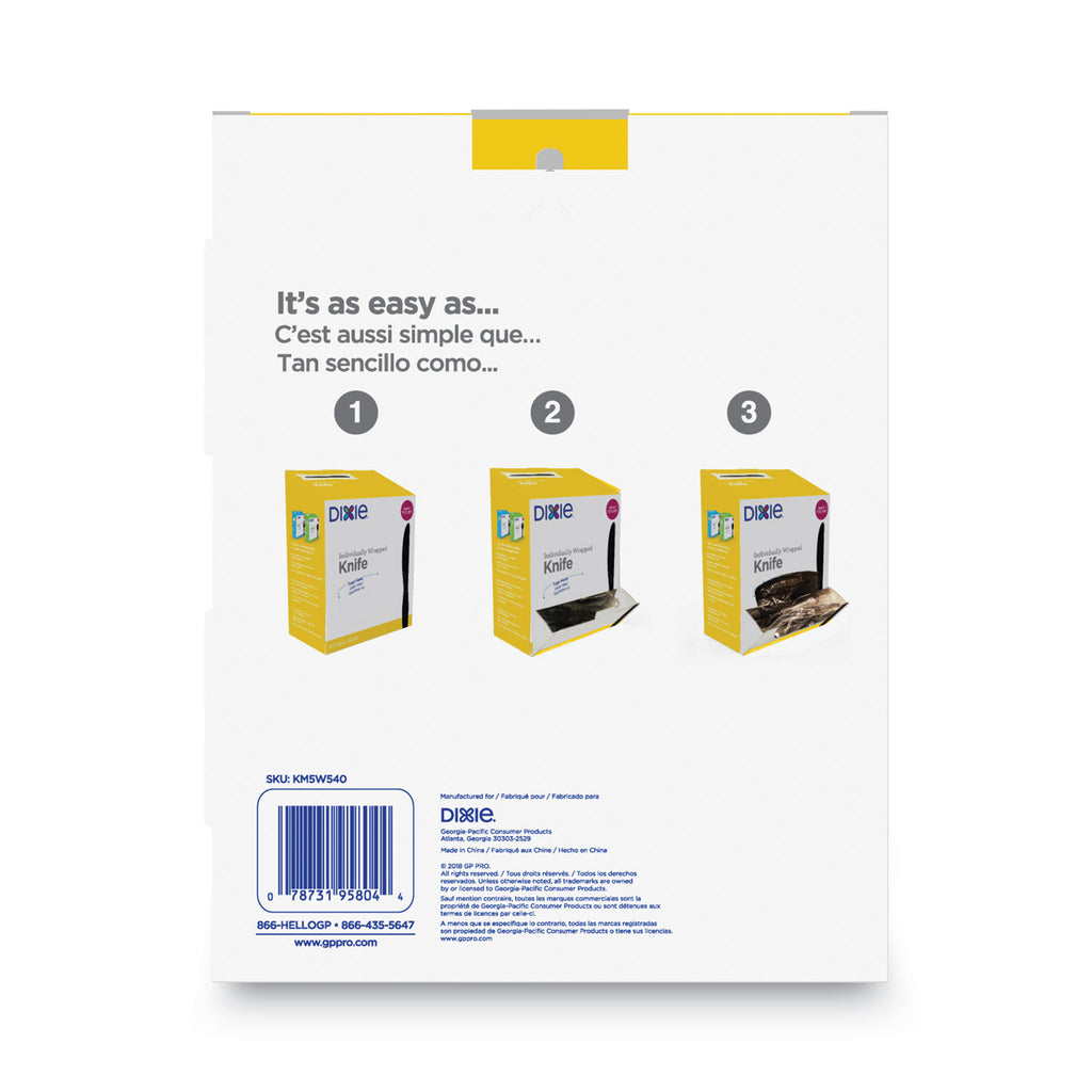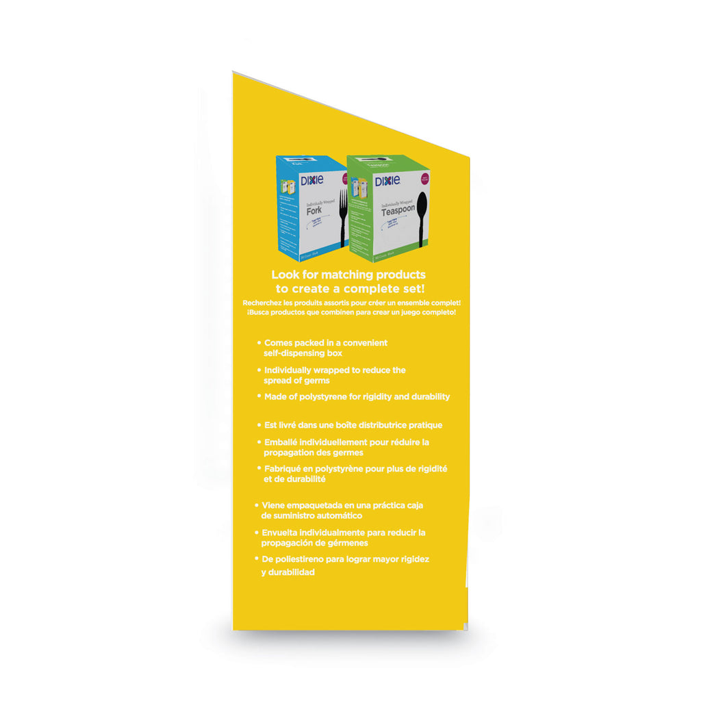 The Dixie® Medium-Weight Polystyrene Disposable Plastic Cutlery Grab-n-Go® lets you get rid of those messy, germ-collecting and wasteful open cutlery containers and replace them with individually wrapped forks in organized self-dispensing boxes. Dixie® Grab-n-Go® cutlery makes being well stocked super easy. The portable, disposable, easy-store boxes convert directly into quick-grab displays. Just open the box and put it on the counter (really). Grab-n-Go® cutlery puts a stay-well spin on break time. Each piece of the Dixie® plastic cutlery is protected by its own plastic covering, so the only person who touches it is the person who uses it. That's called good hygiene. These medium-weight individually wrapped plastic cutlery are great for most foods; perfect for office breakrooms, restaurants and more.