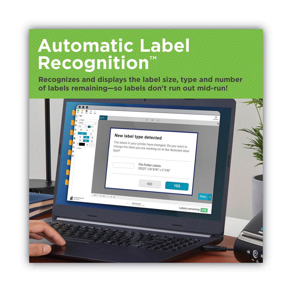 - Automatic label recognition lets you see the size, type, and number of remaining labels at a glance.