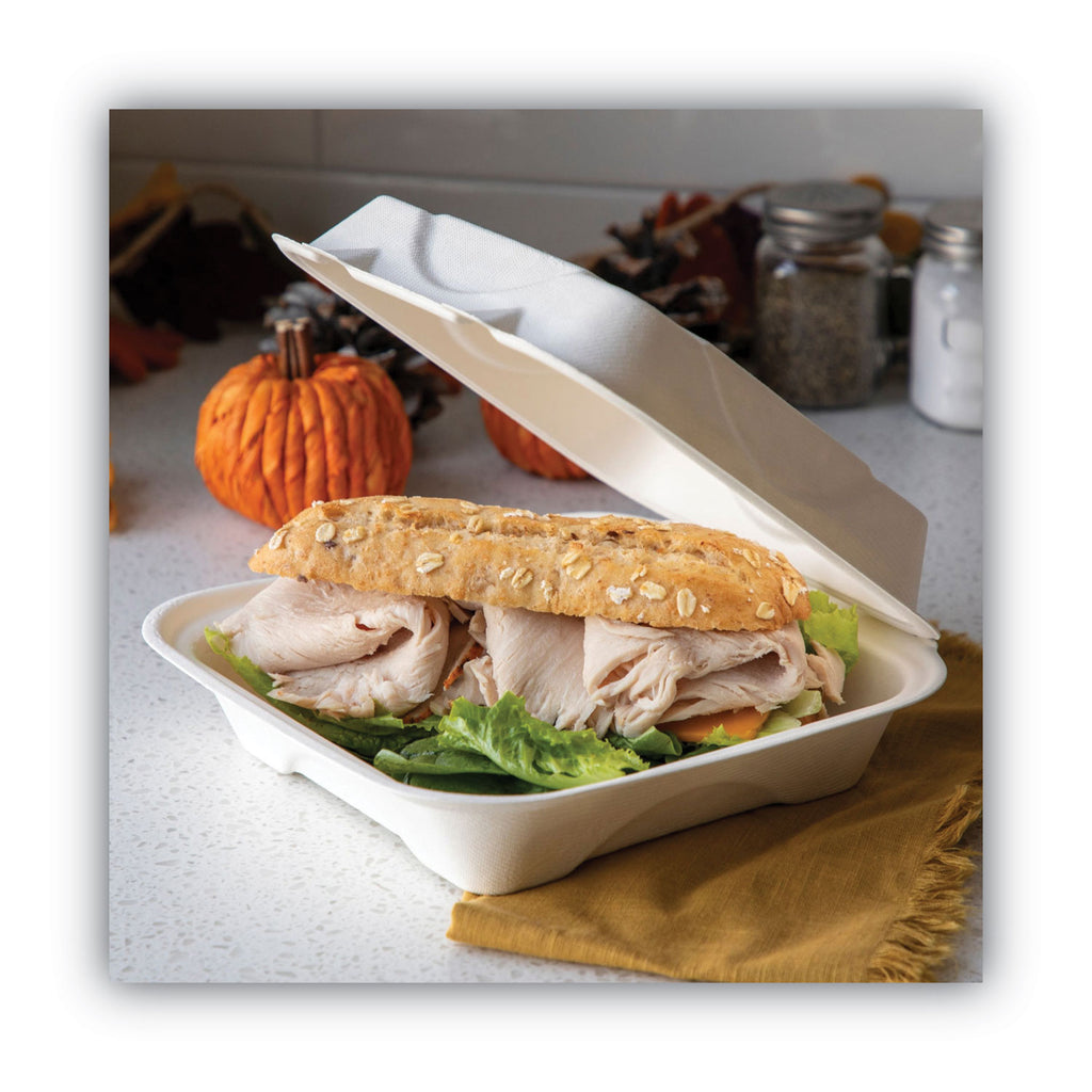 Choose bagasse, a fibrous renewable resource by-product of the sugarcane refining process. Grease- and cut-resistant container provides greater customer satisfaction. Hinged lid speeds and streamlines carryout and to-go orders—no need to hunt around for matching lid. Double-tab closure minimizes the potential for in-transit spills.