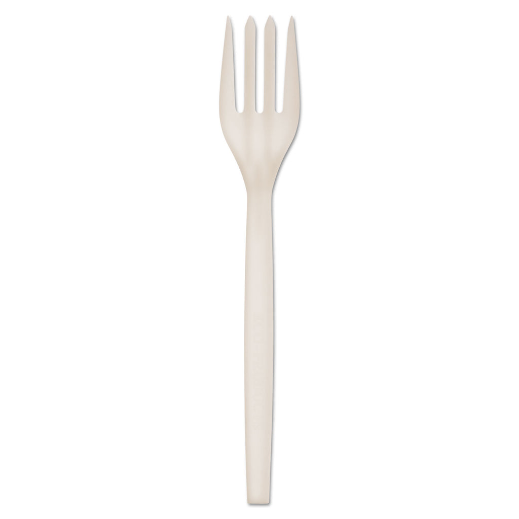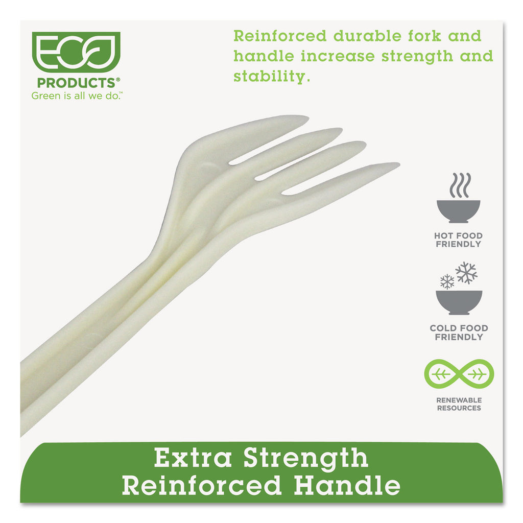 Plant starch cutlery is made with 70% renewable resources. Heat tolerant up to 200°F. Reinforced, ribbed handles provide extra strength. Not compostable.