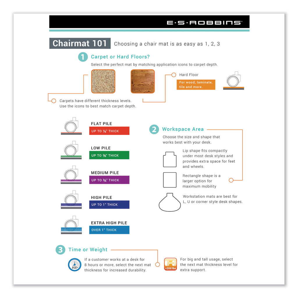 EverLife® chair mats protect your carpet while improving your mobility and comfort. Each chair mat for carpet use is designed with a smooth, ergonomic rolling surface and easy to handle AnchorBar® cleats. ES ROBBINS® EverLife® chair mats are GREENGUARD Gold Certified for low chemical emissions. With no harsh smell, you can breathe easy knowing ES ROBBINS® chair mats are a healthier solution for the home and workplace. Protects carpet up to 0.75" thick, including padding.