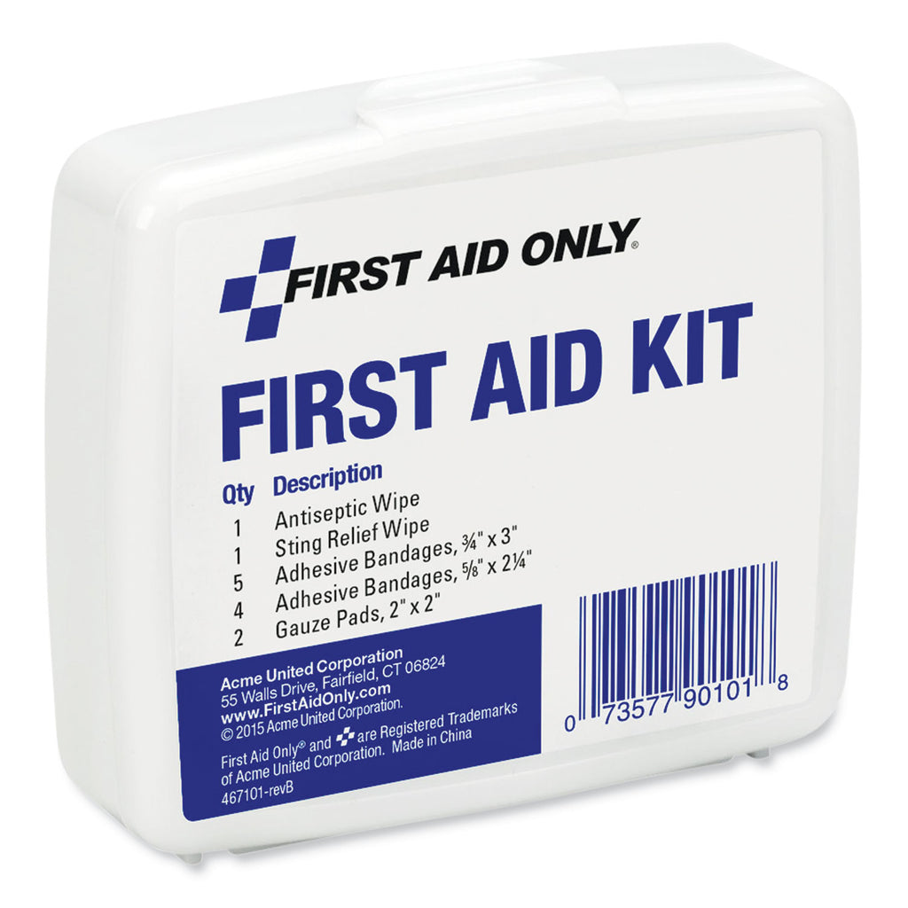 | Package Includes | (5) 0.75" x 3" Plastic Adhesive-Strip Bandages, (4) Junior Adhesive Bandages, (2) 2" x 2" Gauze Pads, (1) Antiseptic Wipe, (1) Sting-Relief Wipe, (1) Plastic Case |