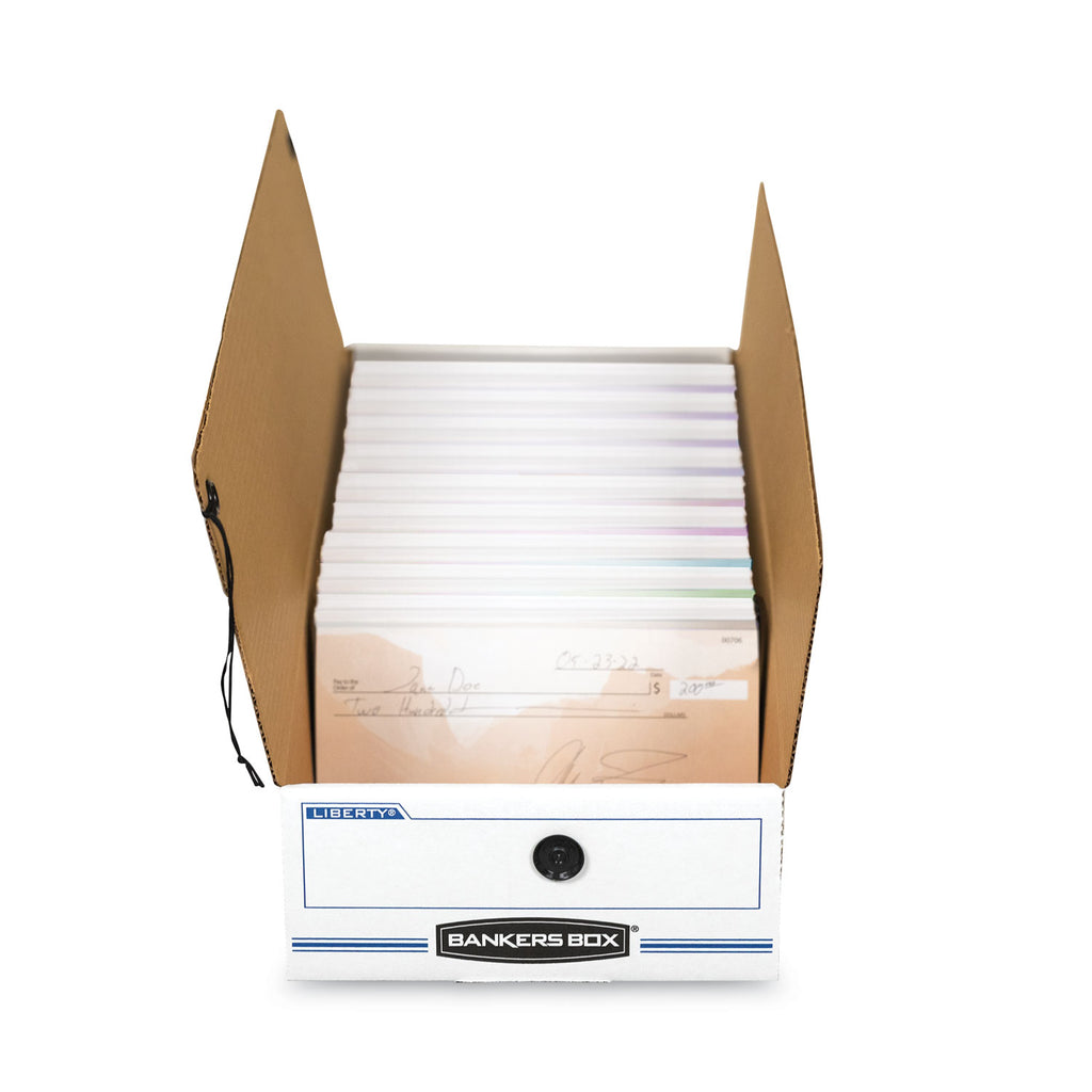 Bankers Box Liberty Check and form boxes feature string & button secure closure—keeps checks and forms in place, even if box is overturned. Made from corrugated cardboard. Easy to store and stack for long term use. Write on the outside of the storage box to make it easier to know what materials are inside. Use in the home, home office, school, or wherever you need to store important information.