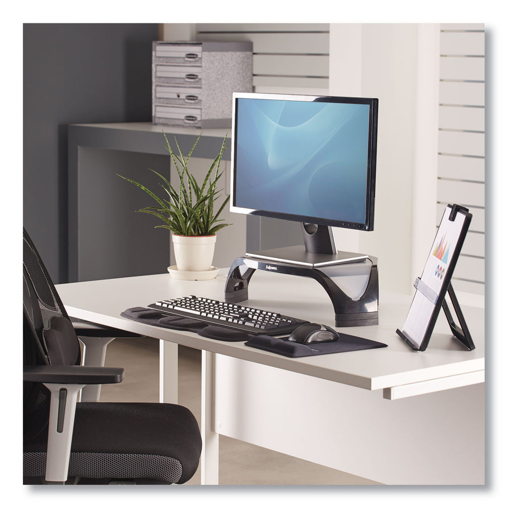 Fellowes Smart Suites Corner Monitor Riser elevates your display to comfortable viewing height to help prevent neck strain. Unique shape fits neatly into desk corner to maximize workspace. Stows laptop or documents underneath to keep desk clutter-free. Three height adjustments for customizable viewing comfort (from 3 7/8" to 5 1/8"). Supports flat panel monitors up to 21" and 40 lbs. Perfect for use in the office, home office, or wherever you need a place to raise your monitor.