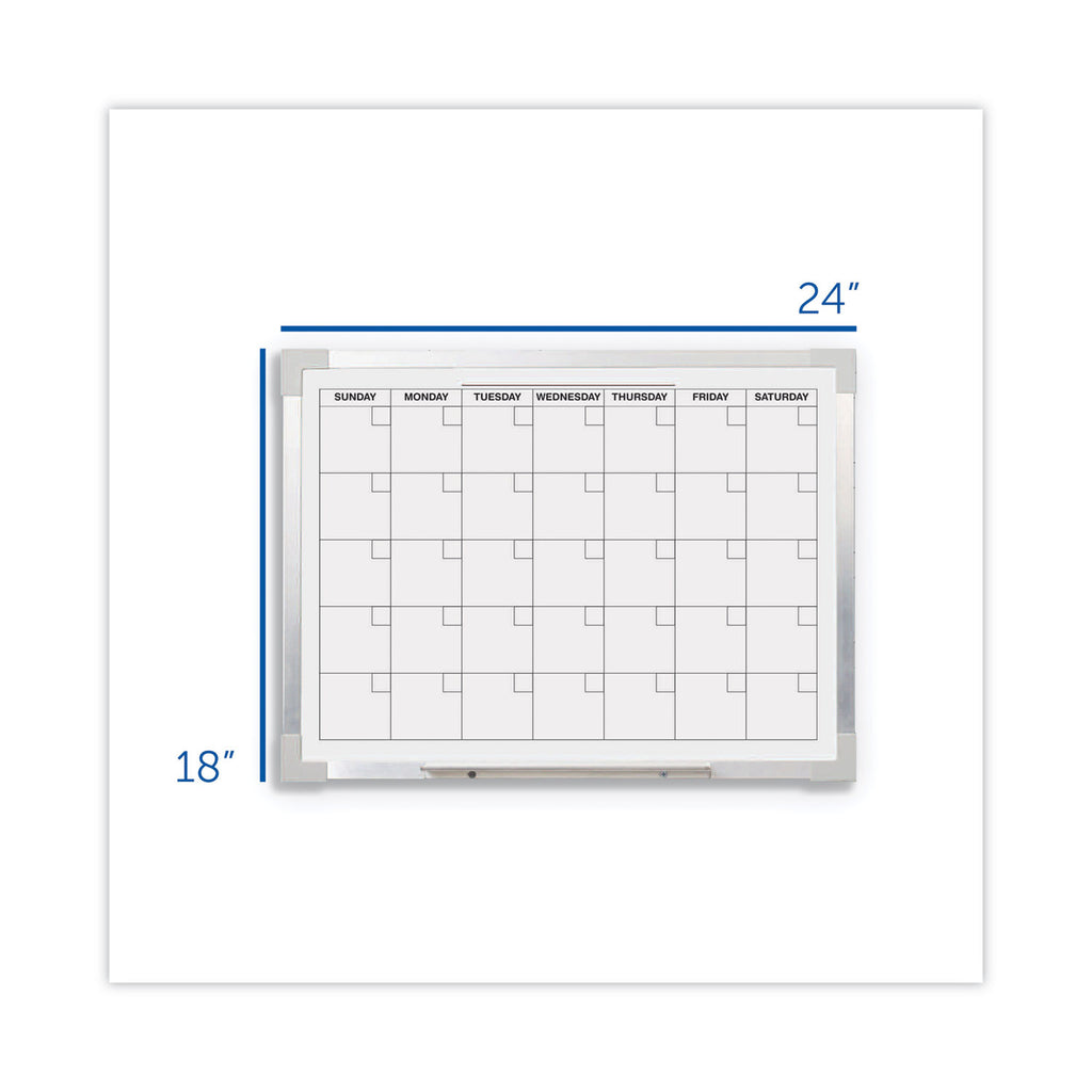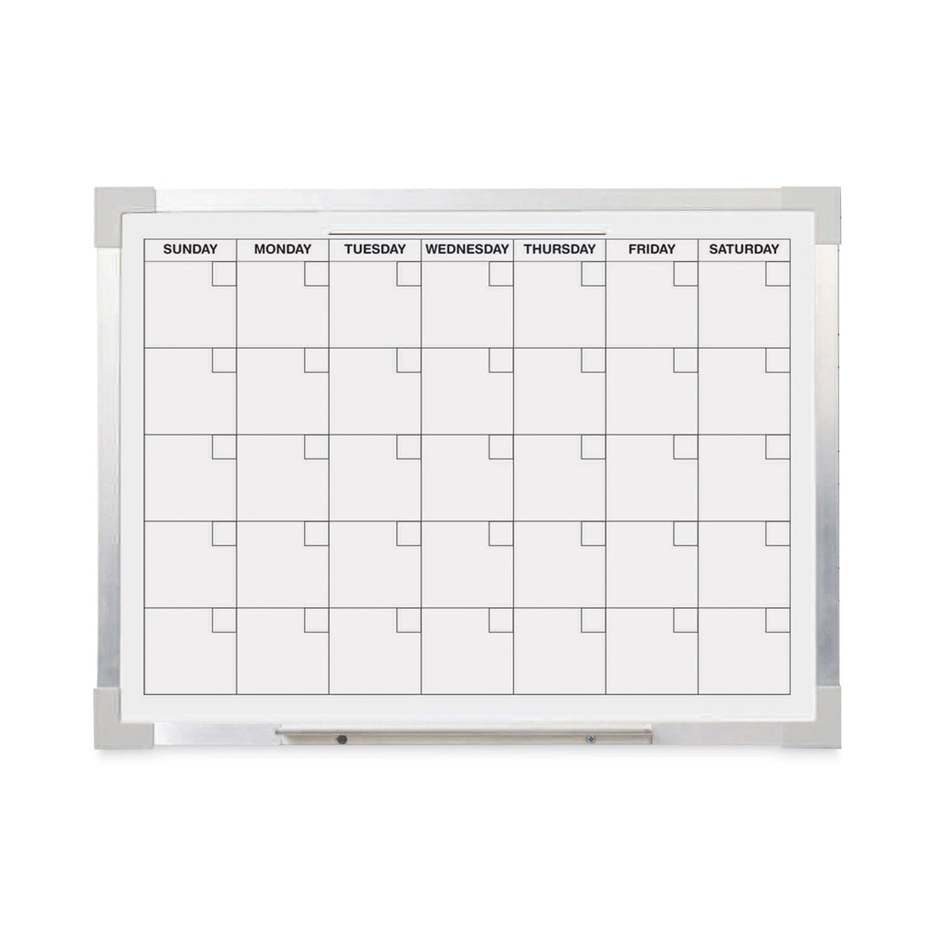 Framed dry erase board features a bright white dry erase surface. Dry erase markers will write easily, dry quickly, and wipe off clean with a soft cloth or eraser. The sleek frame will match any home, school, or office decor! These boards are non-ghosting and have a high-quality surface. Blank one-month calendar to fill in and personalize.