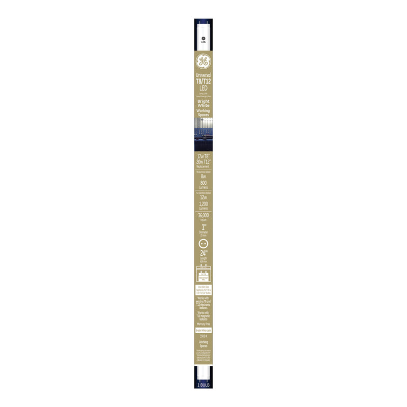 GE's T8 LED tubes replace 24-inch T8—1-inch diameter—fluorescent bulbs using the existing fixture and electronic ballast. It's slim size fits in the same fixtures as traditional 24-inch T8 fluorescent bulbs. Why make the switch to LED? GE's LED tubes are rated to last 36,000 hours. They provide long 16-year life based on six hours use per day, so you'll replace less often.