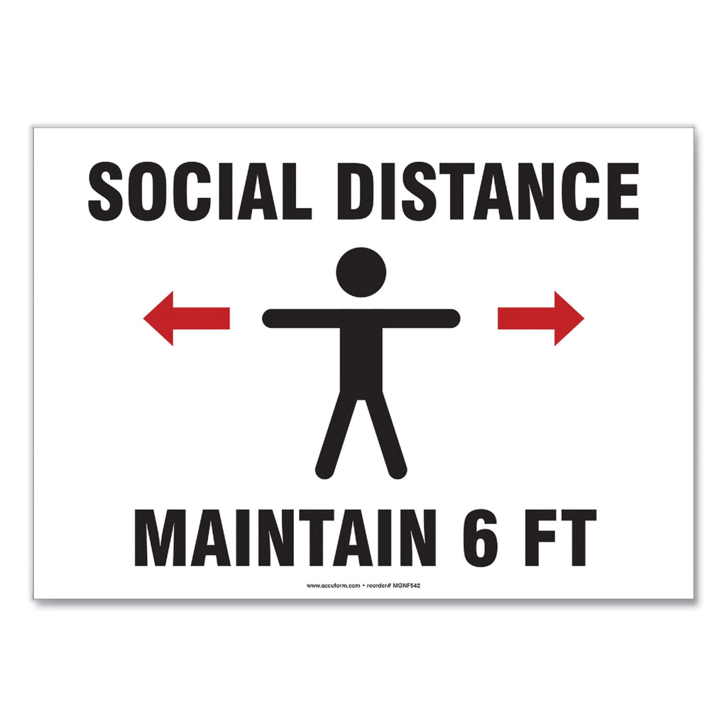 Alert and remind visitors, customers, and employees to practice social and physical distancing to prevent the spread of COVID-19, the Coronavirus. Durable plastic has slight flex that is ideal for indoor and sheltered outdoor environments. Printed surface has clear UV protective overcoat. Recycled content with UV inhibitors and good impact resistance. Rounded corners with 3/16" mounting holes for installation.