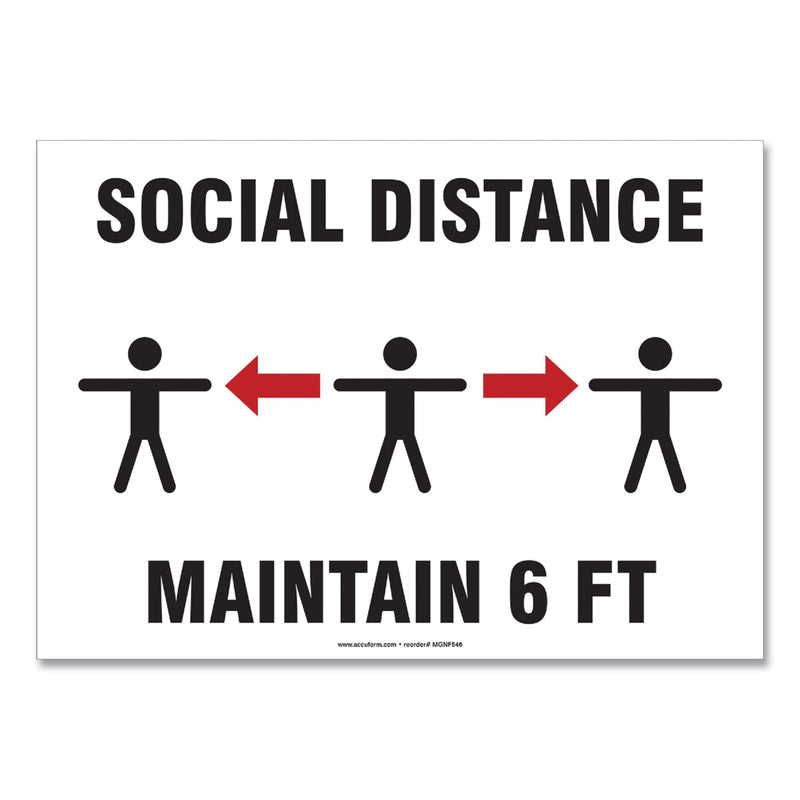 Alert and remind visitors, customers, and employees to practice social and physical distancing to prevent the spread of COVID-19, the Coronavirus. Durable plastic has slight flex that is ideal for indoor and sheltered outdoor environments. Printed surface has clear UV protective overcoat. Recycled content with UV inhibitors and good impact resistance. Rounded corners with 3/16" mounting holes for installation.