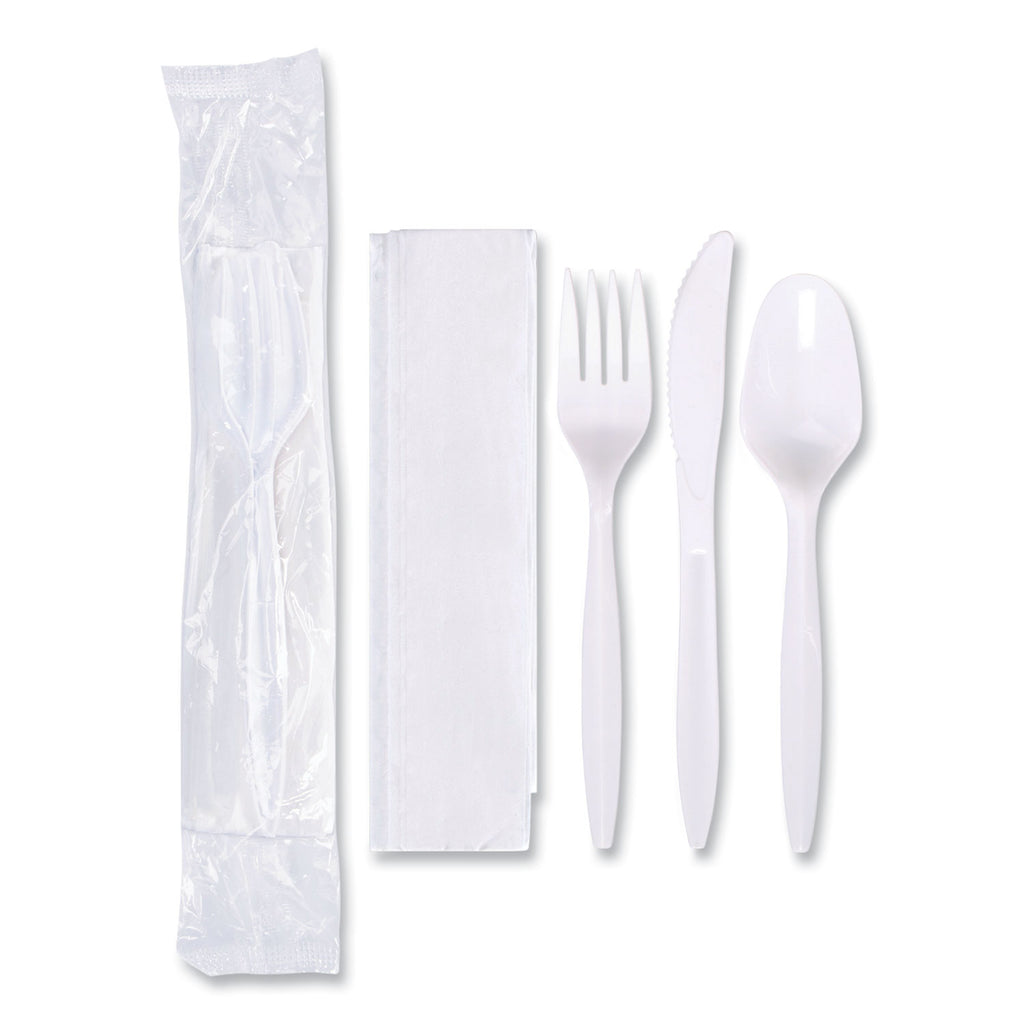 Saves time and provides a economic, disposable alternative to linen-rolled cutlery. Offers a safe and sanitary solution to your food delivery and take out food service. Kit includes 2-ply 12 x 13 napkin, fork, knife and spoon.