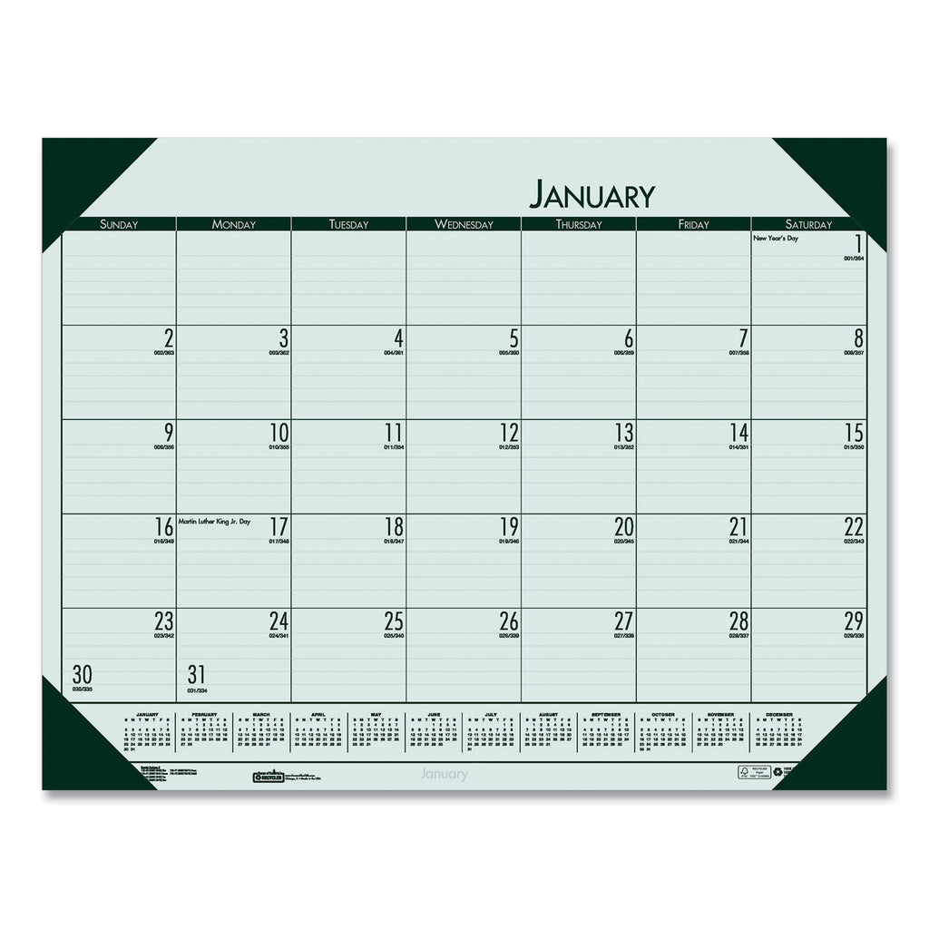 Pastel color recalls a color from nature. Strong, reinforced color-matched leatherette corners complement the pad's paper while keeping the pages in place and protected. Full-year reference calendar aids in planning throughout the year. Features numbered weeks, Julian dates and days remaining. Lightly ruled daily blocks help keep notations neat. Made entirely of recycled materials.