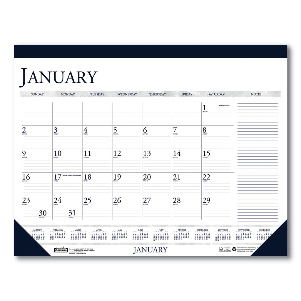 Subtle, deep blue and gray printing is soothing and easy on the eyes. Perforated pages are stitched at the top with matching reinforced corners. Generous note space and a full, 12-month reference calendar for long-term planning on each page. Includes ruled daily blocks, Julian dates and days remaining. Made entirely of recycled materials.