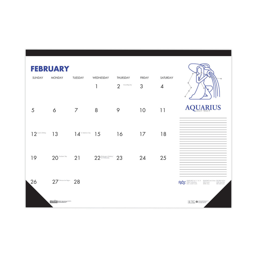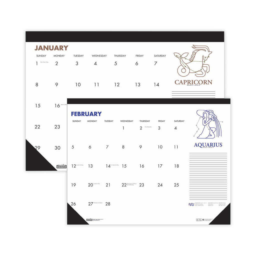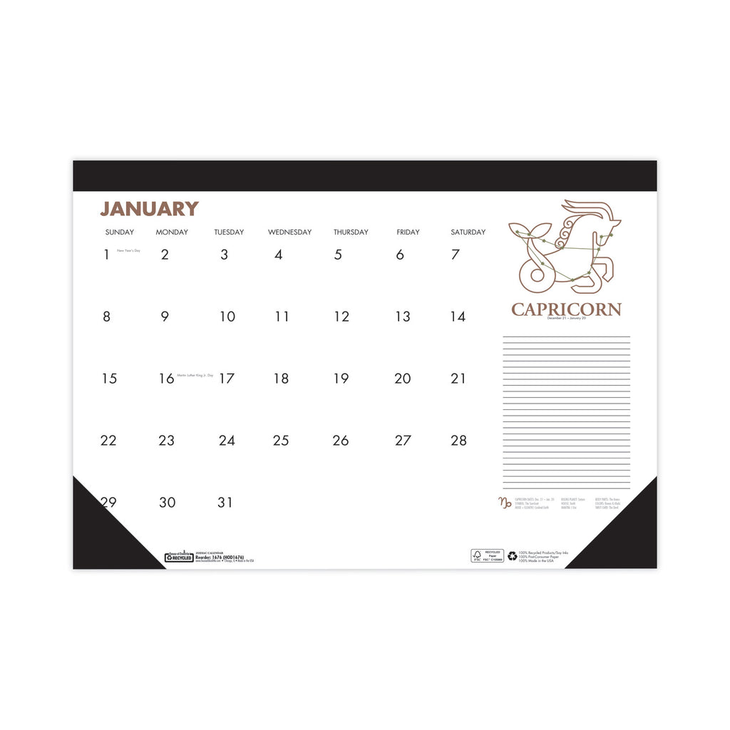 House of Doolittle Recycled Zodiac Desk Pad Calendar has a clean open space design. Each month, January to December, the zodiac symbol along with the star pattern is displayed with the astrological time frame of the month. It also displays information about the astrological sign which includes elements, dates, ruling planet, house, mantra, body part, color and tarot card.