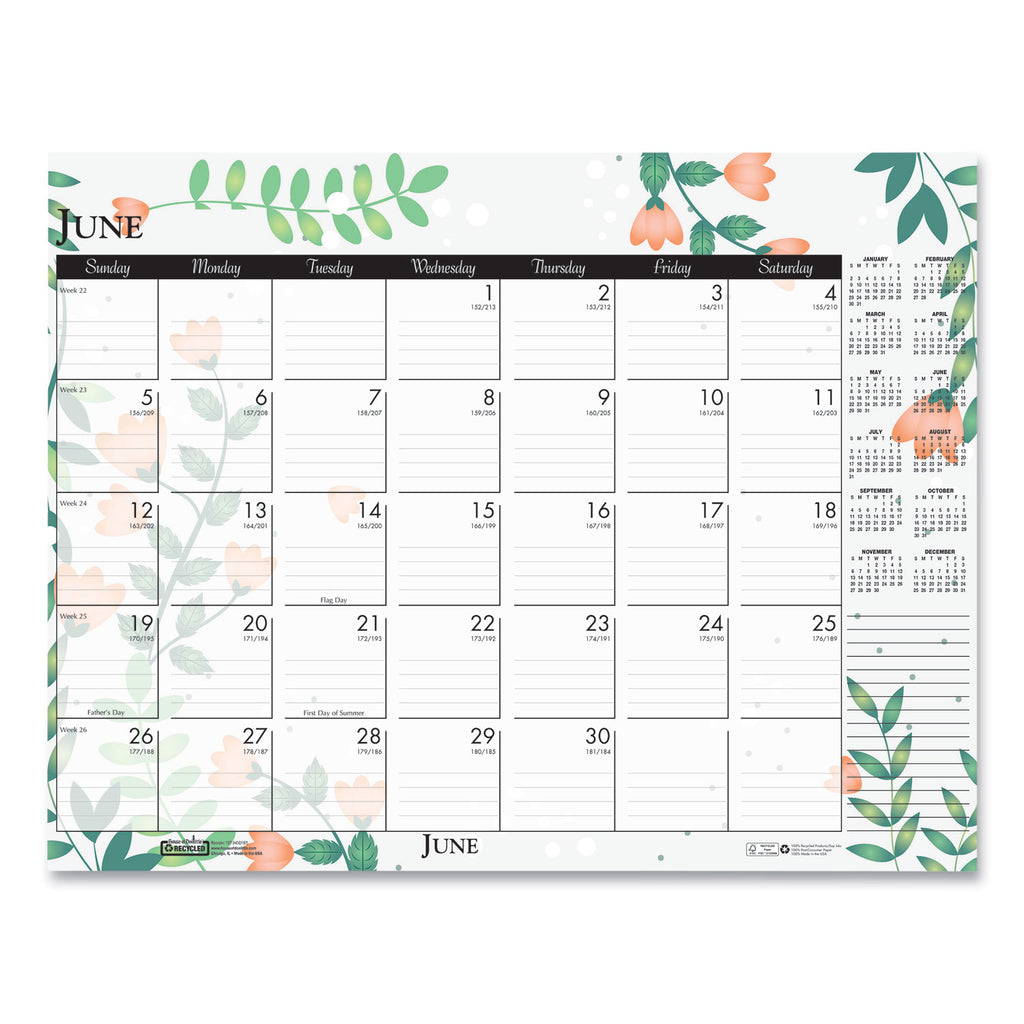 Brighten up your desk with a different wild flower design each month. The pages are bound and perforated at the top with black leatherette binding and matching reinforced corners for durability throughout the year. Full year reference calendar for long term planning. Monthly view on each page featuring ruled blocks allocated for each day. Includes numbered weeks, Julian dates, days remaining, and ample note space. Printed on recycled paper with soy-based inks.