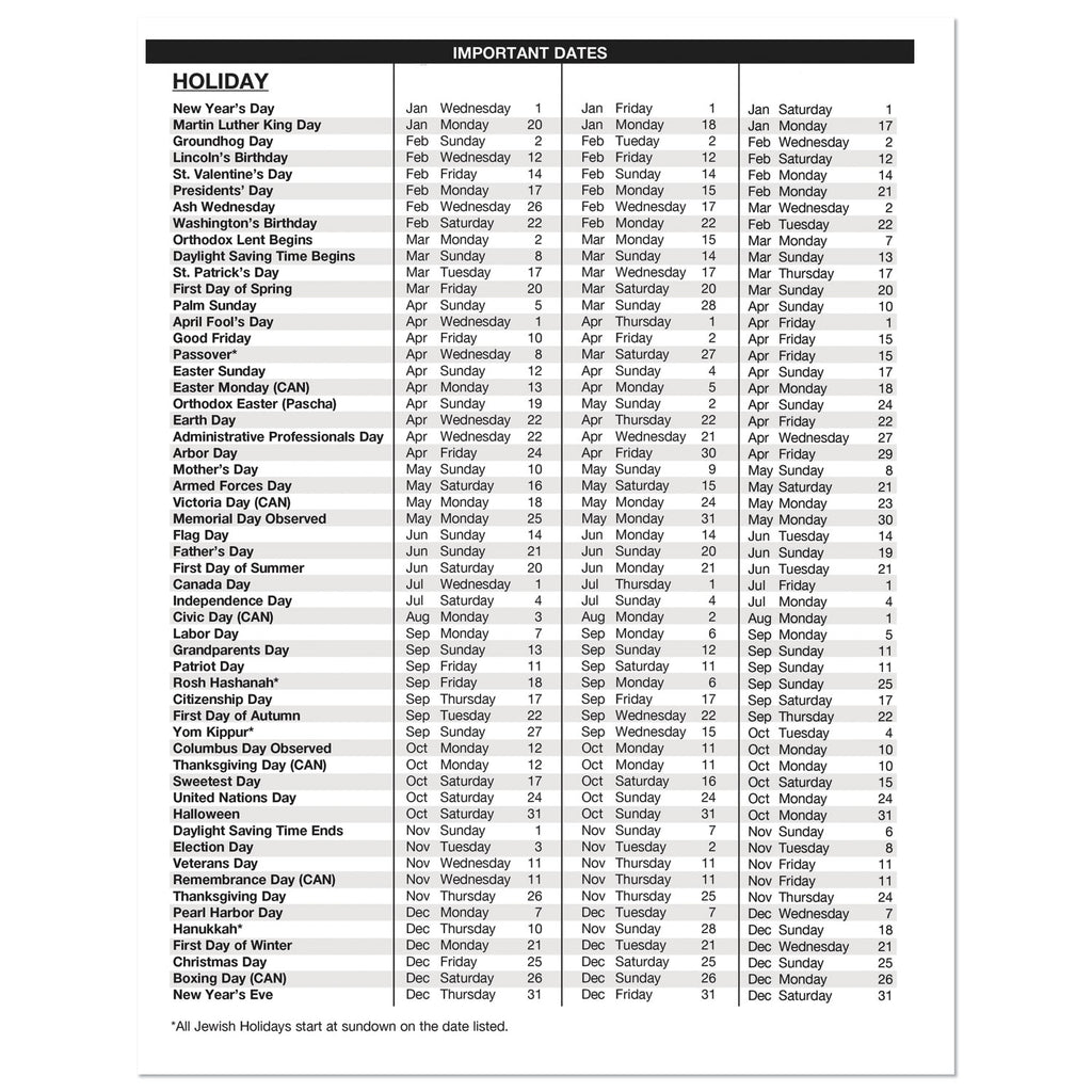 | Separate Sections | Expense Log, Notes/Memos, Phone Messages, Reminders, Three-Year Holiday List, Three-Year Reference Calendar |