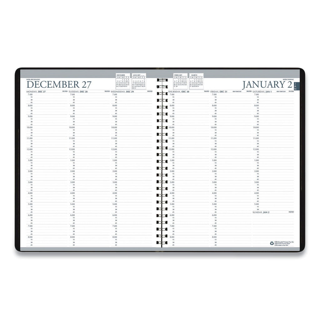 Vertical format with one weekday per column, quarter-hourly appointments and six days per week. Weeks start on Monday with a one-week per two-page layout. Three-year reference calendar page aids in long-range planning. Includes a double-sided storage pocket. Additional page lists important holiday dates over a span of three years. Features printed monthly indicators to help you quickly find the date you need. Made entirely of recycled materials.