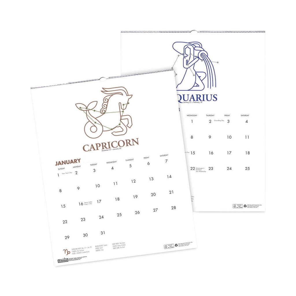 House of Doolittle Recycled Zodiac Wall Calendar has a clean open space design. Each month the zodiac symbol along with the star pattern is displayed with the astrological time frame of the month. It also displays information about the astrological sign which includes elements, dates, ruling plant, house, mantra, body part, color and tarot card. Printed on heavy duty paper printed with soy-based inks. Strong wire binding firmly keeps the pages together in one place. Includes a wire hanger to easily hang the calendar on the wall.