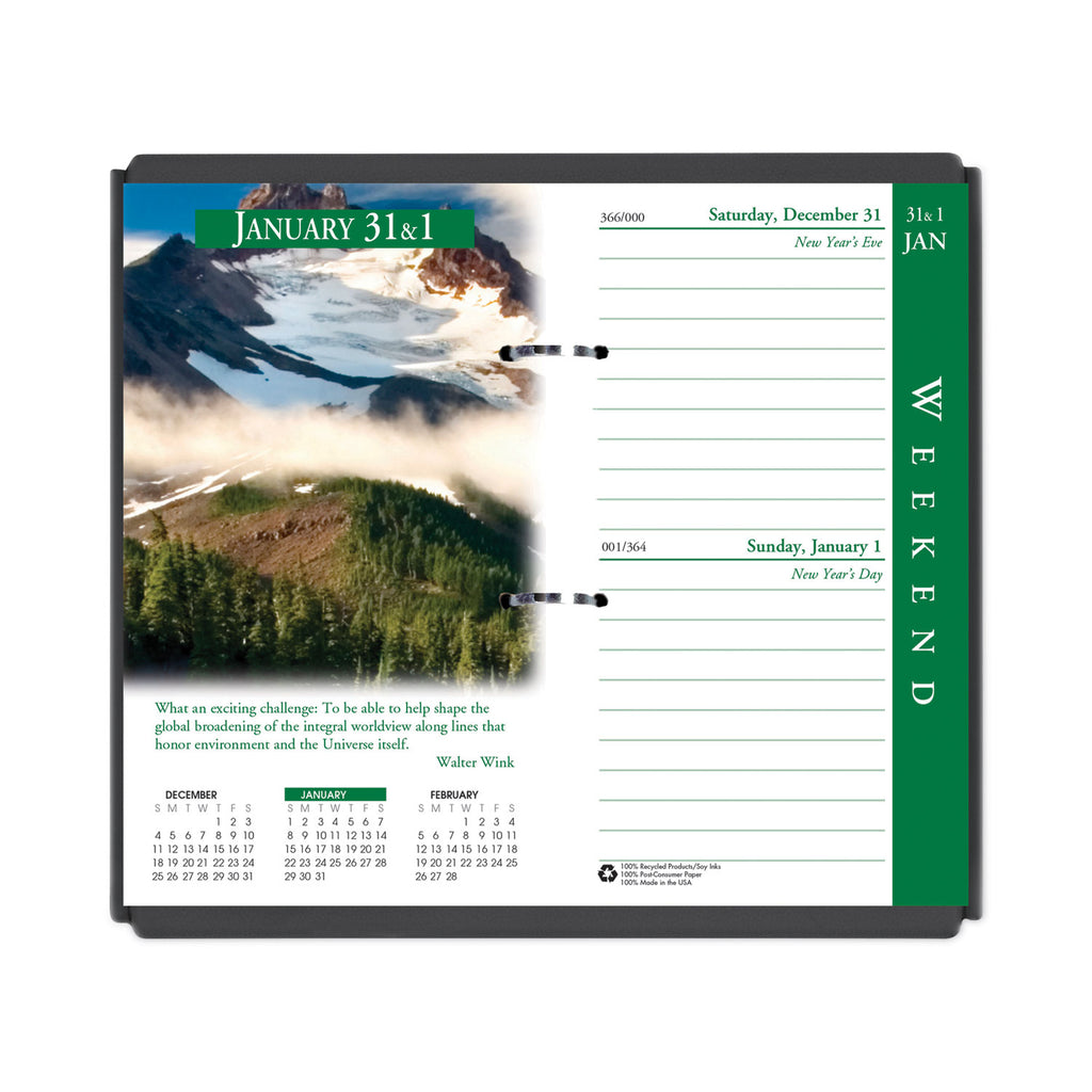 Full-color nature photography combined with inspirational quotes. Color-coded page edge speeds date search. Three-month reference calendar. Includes Julian dates and days remaining. Ruled for notes and appointments. Two pages per weekday and weekend days are combined on one page. Fits standard base. #17 calendar base sold separately. Made entirely of recycled materials.