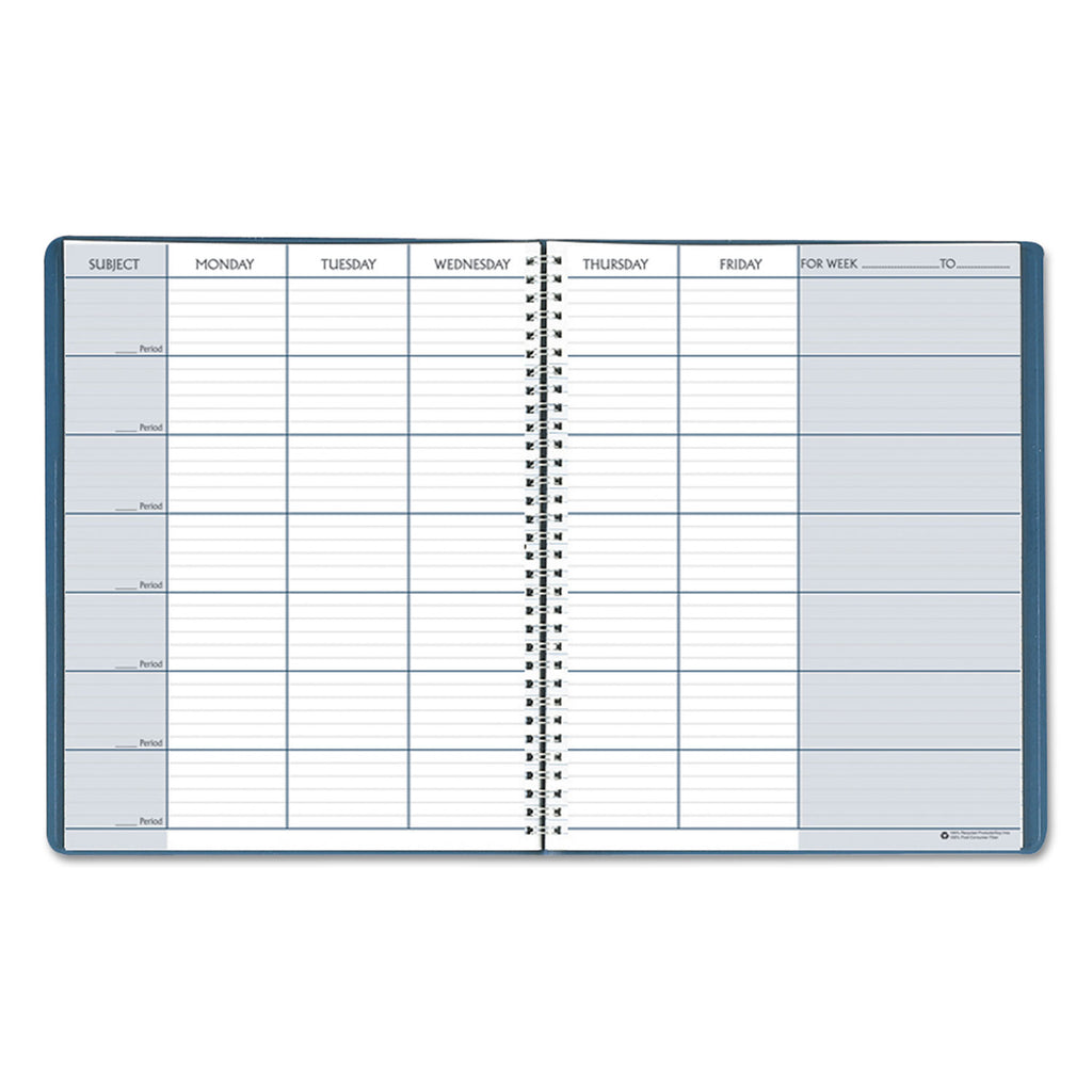 Handy teacher's helper features 45 undated weekly spreads, each divided into seven periods, with space for notes. Includes seating chart, test and attendance records and term program. The planner is bound strongly with wire-binding and the cover features a blue, embossed leatherette finish. Made entirely of recycled materials.