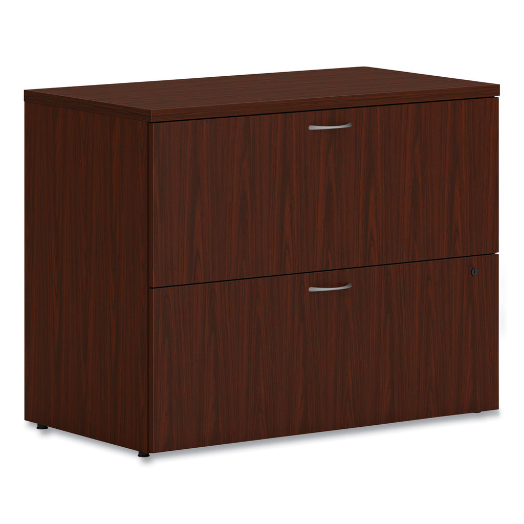Lateral file accommodates the largest volume of filing in an efficient format that saves floorspace. Fully assembled and ready to use. Steel ball-bearing drawer suspensions operate easily and quietly. Drawers are equipped with standard hangrails to hold either letter- or legal-width hanging files. Drawers open fully to give easy access to all contents. File folders are arranged side-to-side to take up less aisle space when drawers are opened. Durable laminate resists scratches, spills, and stains.