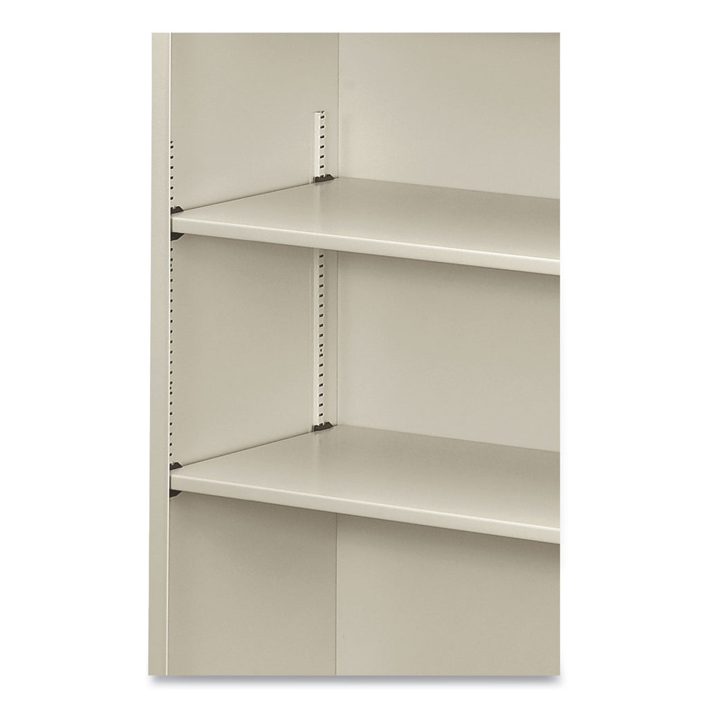 34-1/2w x 12-5/8d. Shelves adjust in 1/2" increments. Straight sides and backs allow flush alignment. Shelf count includes bottom of bookcase. Bookcases ship assembled.