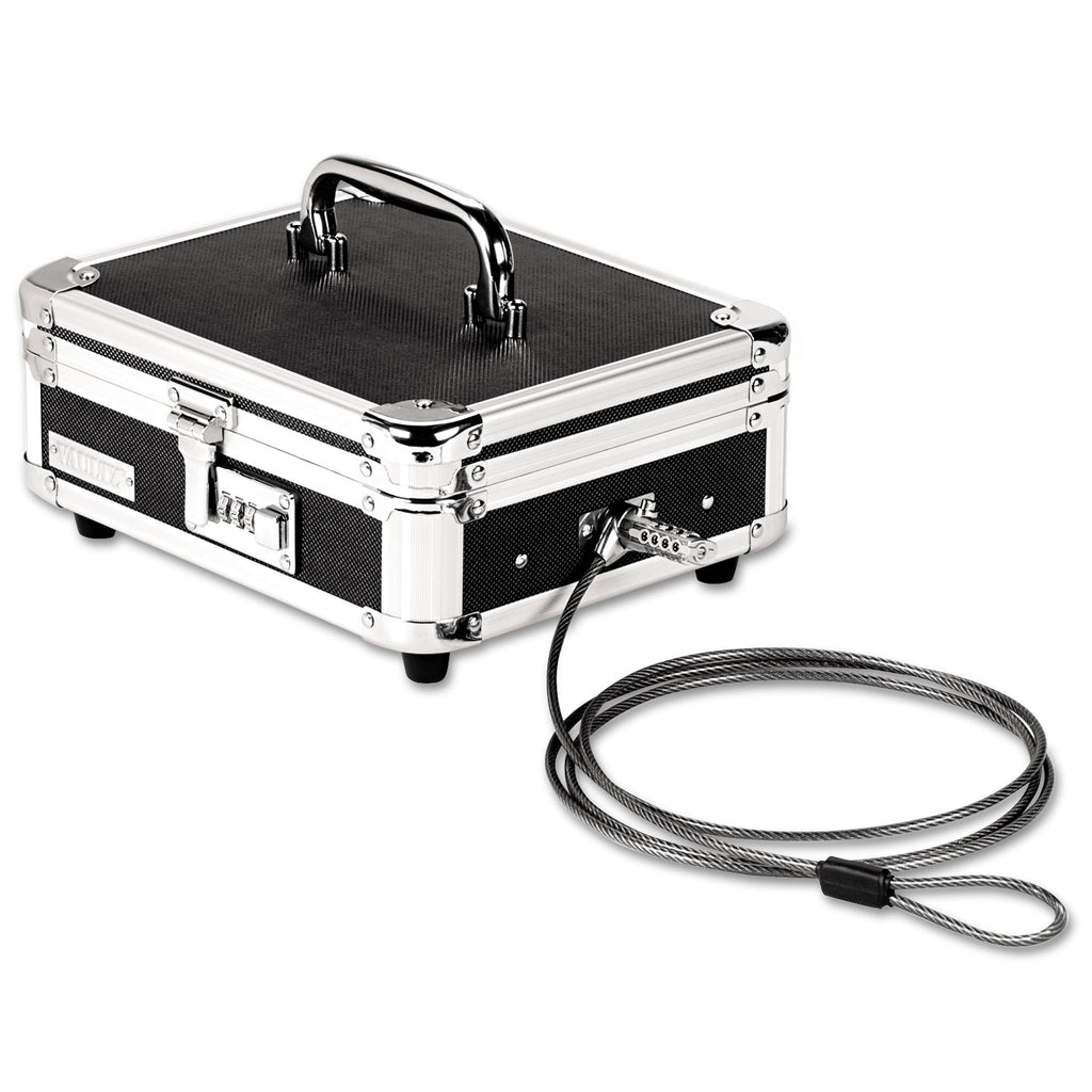 Keep your valuables safe and secure in this attractive black cash box with a plastic inset tray to organize bills and coins. With plenty of room underneath, the cash box can hold tickets, receipts, checks or other valuables. The smooth chrome handle allows for comfortable carrying and a tumbler lock is available for convenient keyless locking. Rubber feet prevent skidding and scuffing.