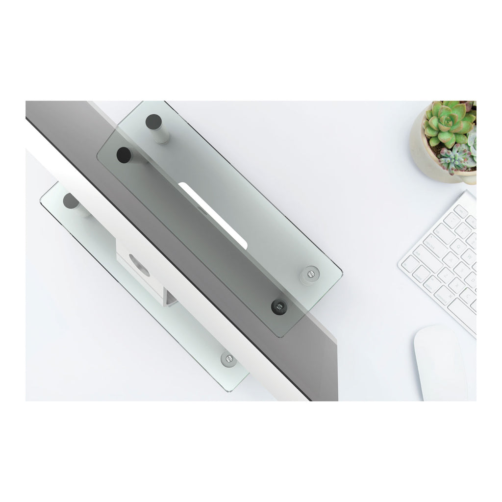 - Elevate your monitor to a proper eye position with this sleek looking tempered glass monitor riser.