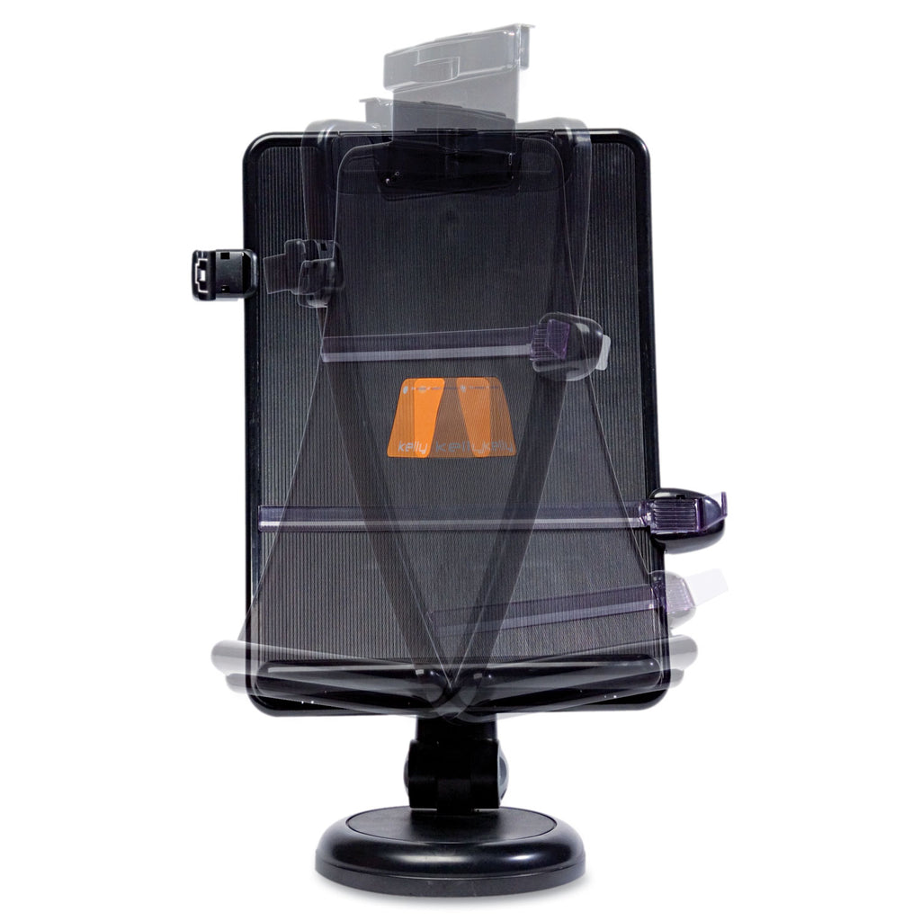 Unique curved tray holds copy in place, reduces overhead glare and improves viewing angles. Weighted base gives great stability. Simple tension knobs easily adjust height, angle and tilt. Spring-loaded, reversible line guide with slight magnification. Attached pen holder.