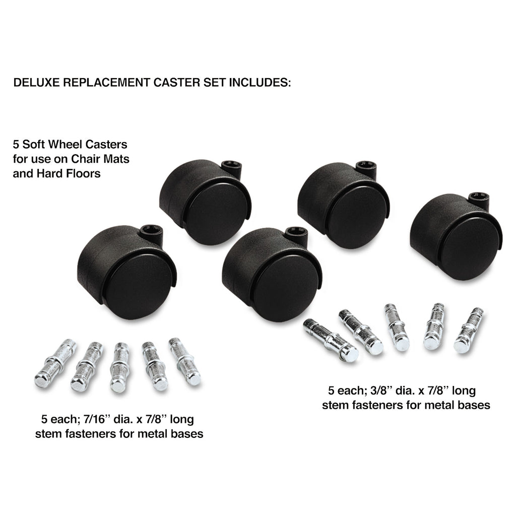 - Includes 5 wheels and 10 stem fasteners; 5 each 7/16" x 7/8" and 5 each 3/8" x 7/8" fits most metal bases.