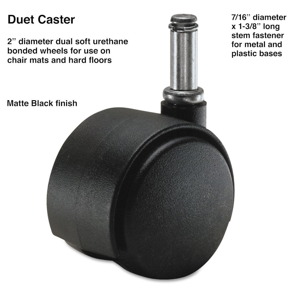 Contemporary design, strength and performance make these replacement casters an excellent choice for office and home furnishings. With appropriate stems and fasteners, each caster can be used on wood, metal and tubular metal chairs, furniture and other equipment. All casters carry the manufacturer's guarantee against defects in material and workmanship. For light to medium duty. Wheels rotate independently. HOW TO SELECT CASTERS:1. Remove caster from leg of chair base. 2. Match the stem of the caster to diagram. Select the correct length and diameter. (Tops of stems can be flat or rounded—either will fit.) 3. Determine if caster is to be used on chair mats, hard floors or carpeting. Choose soft wheel casters for use on chair mats, linoleum (vinyl), and hard floors; hard wheel casters for carpeting. Weight rated 110 lbs. per caster wheel.